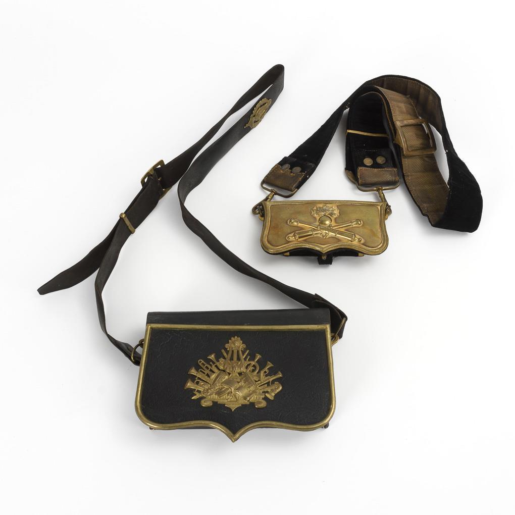 Französischer Artillerie-Kartuschkasten: Messingauflage mit gekreuzten Kanonen und Granate, Bandelier mit Tresse und Walkstoff. / Kartuschkasten für einen Militärmusiker: Messingauflage als Instrumenten-Trophäe, Schulterriemen aus Leder mit Beschlag in Form einer Lyra. Starke Alters-/Gebrauchsspuren, Artillerie-Kartuschkasten eventuell mit Ergänzungen.