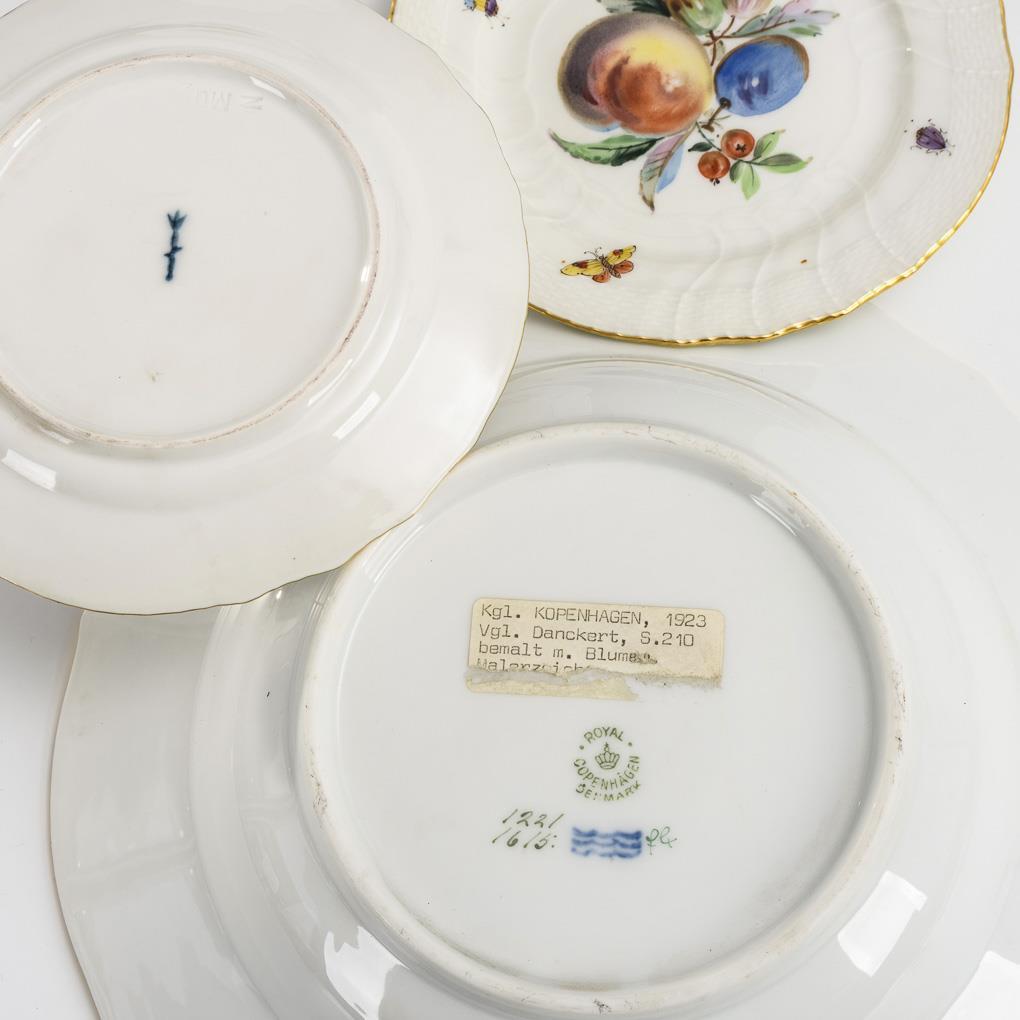 Form "Neuozier". 1x Royal Copenhagen, 1946: Suppenteller mit Blumenmalerei. / 5x KPM Berlin, Zeptermarke mit 2 Schleifstrichen, 1. H. 20. Jh., ohne Malermarke: Dessertteller mit Frucht- und Insektenmalerei.