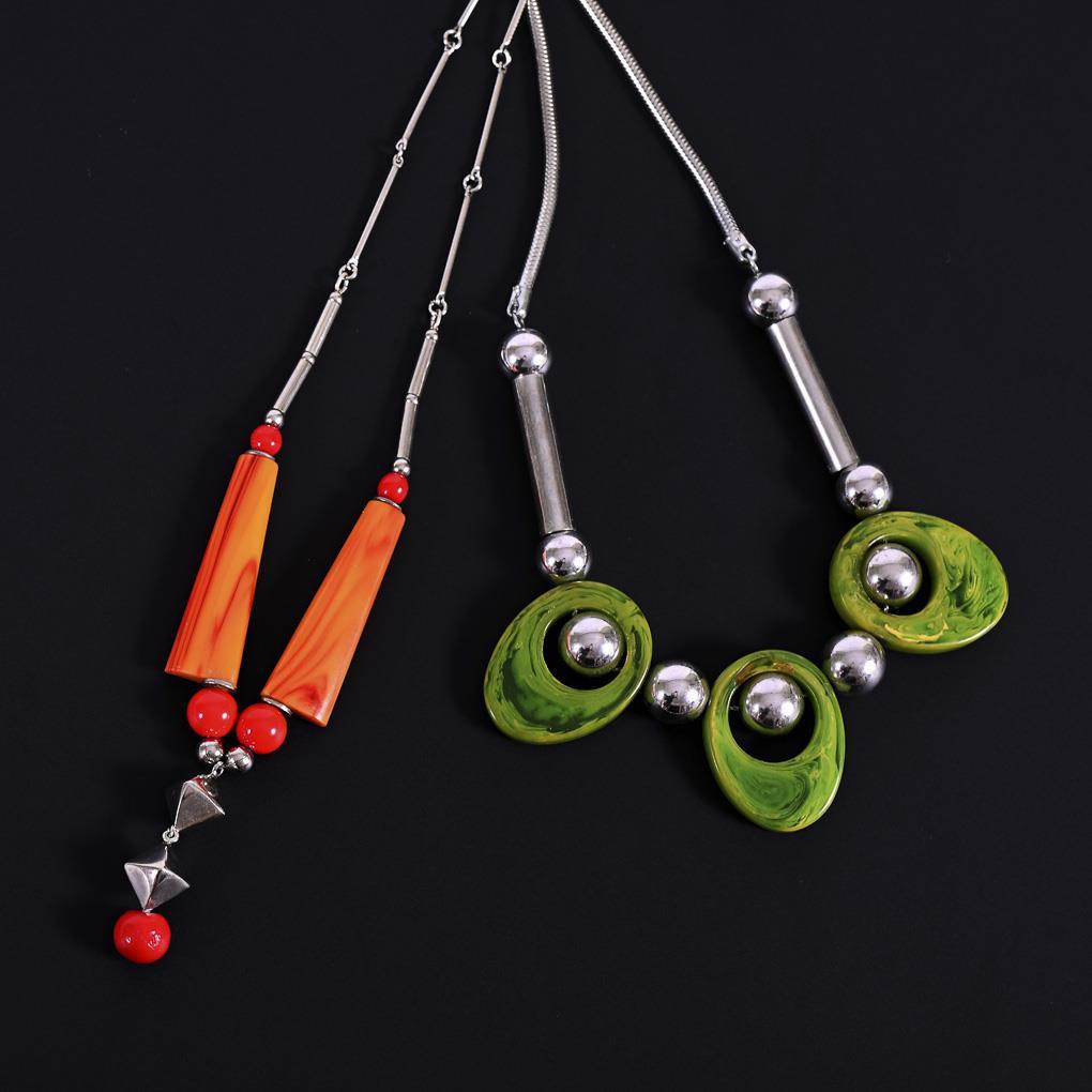 Metall- und Galalithglieder zwischen Gliederketten, an Ringfederschließen.