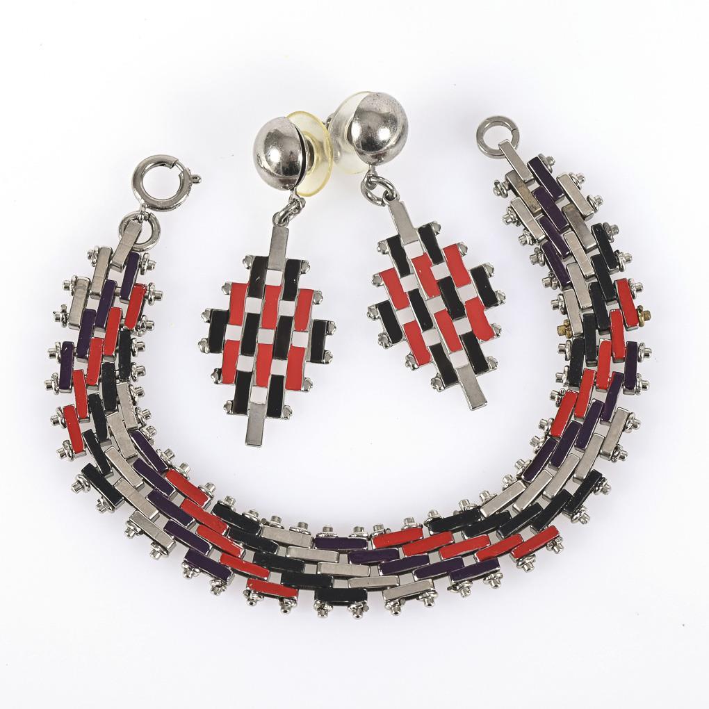 Metall-Gliederband, partiell 3-farbig, und passendes Ohrhängerpaar 2-farbig lackiert. Ringfederschließe. Steckmechanik.