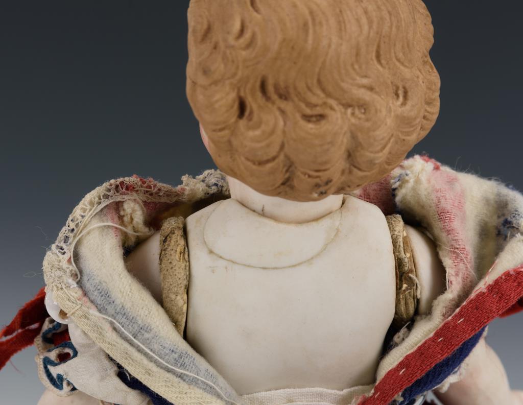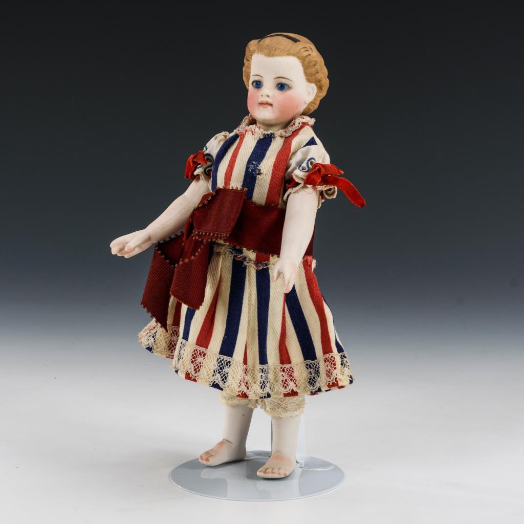 Püppchen mit Kurbelkopf, festen blauen Augen, geschlossenem Mund und modellierten Haaren mit schwarzem Haarband. Körper mit festen Beinen. Blau-weiß-rot gestreiftes Kleidchen. Halsansatz und Halspfanne beschädigt (Ausbruch im Nacken).