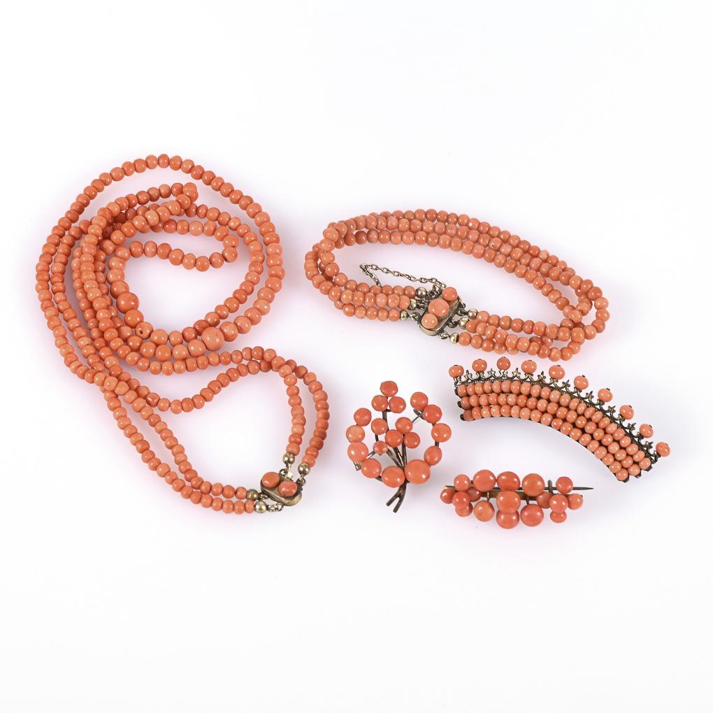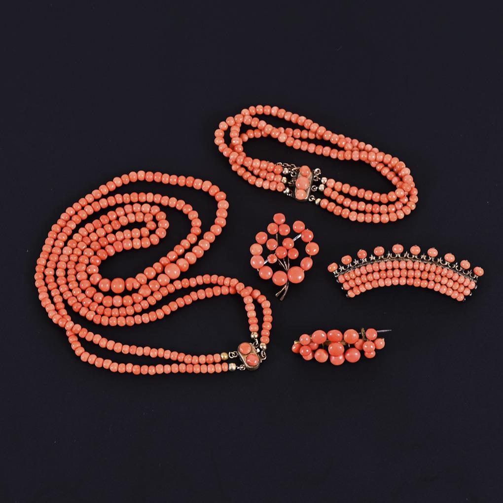 2-reihige Halskette, 3-reihiges Armband und 3 Broschen mit Korallen. Kastenschlösser, Hakenverschlüsse.