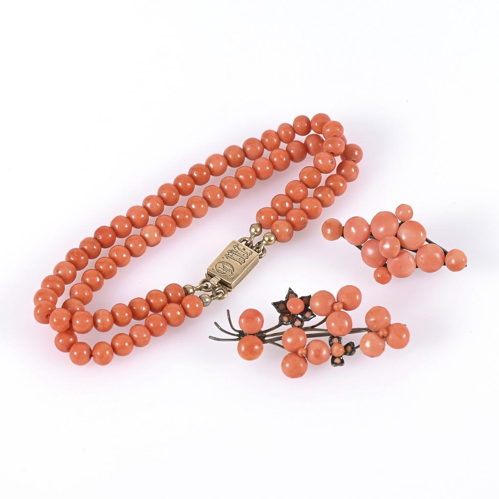2-reihiges Korallenarmband und 2 Broschen, um 1900.