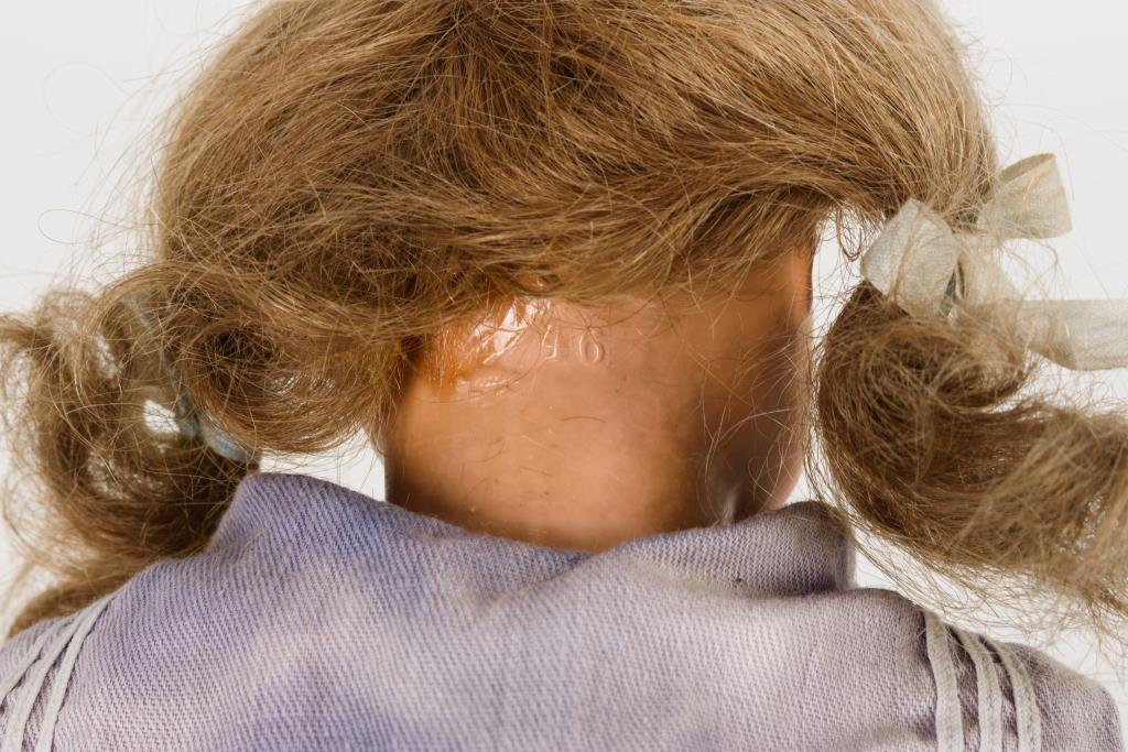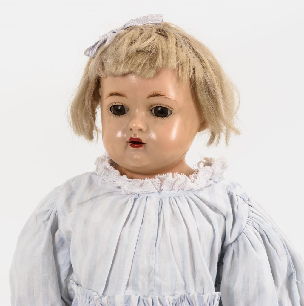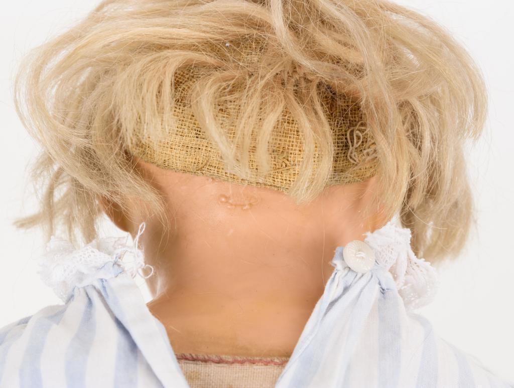 Matrosenmädchen mit Kurbelkopf, blauen Augen und festgeklebter blonder Mohairperücke. 11-teiliger Gliederkörper. Helles Kleid mit blauen Streifen. / Blondes Brustkopfmädchen mit Schlafaugen, offenem Mund und Mohairperücke. Stoffkörper mit Reparaturen. Helles Kleid mit grauen Streifen. 1x Schlafaugen fest, Kopf mit retuschierten Rissen, Arme wohl ergänzt. 1x ohne Zähnchen, Lippen retuschiert.