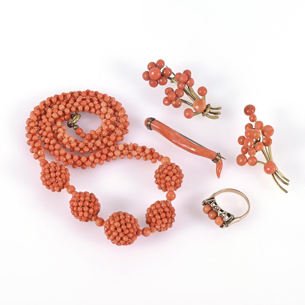 Schnürkette, 2 Blütenbroschen, Astbrosche und Ring mit Korallen. Ringfederschließe, Hakenverschlüsse und mittlere Schiene.