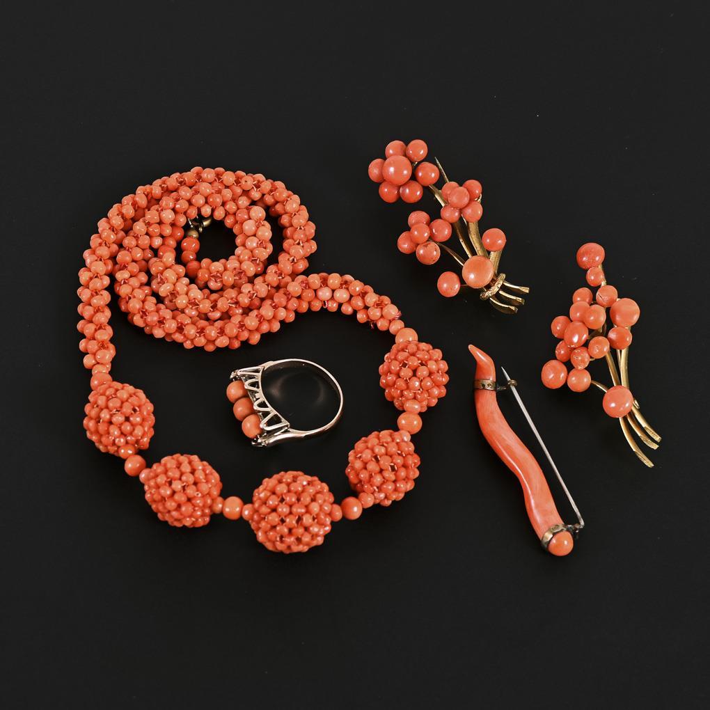 Korallenkette, 3 Broschen und Ring.