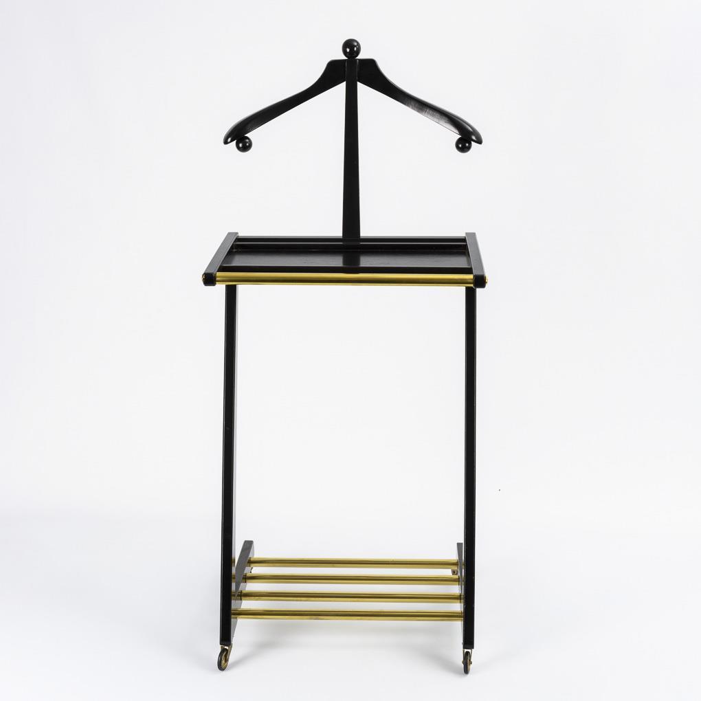 Handlicher, rollbarer Kleiderständer mit herausziehbaren Messingstäben und Ablagefläche. Wohnfertig restauriert.
