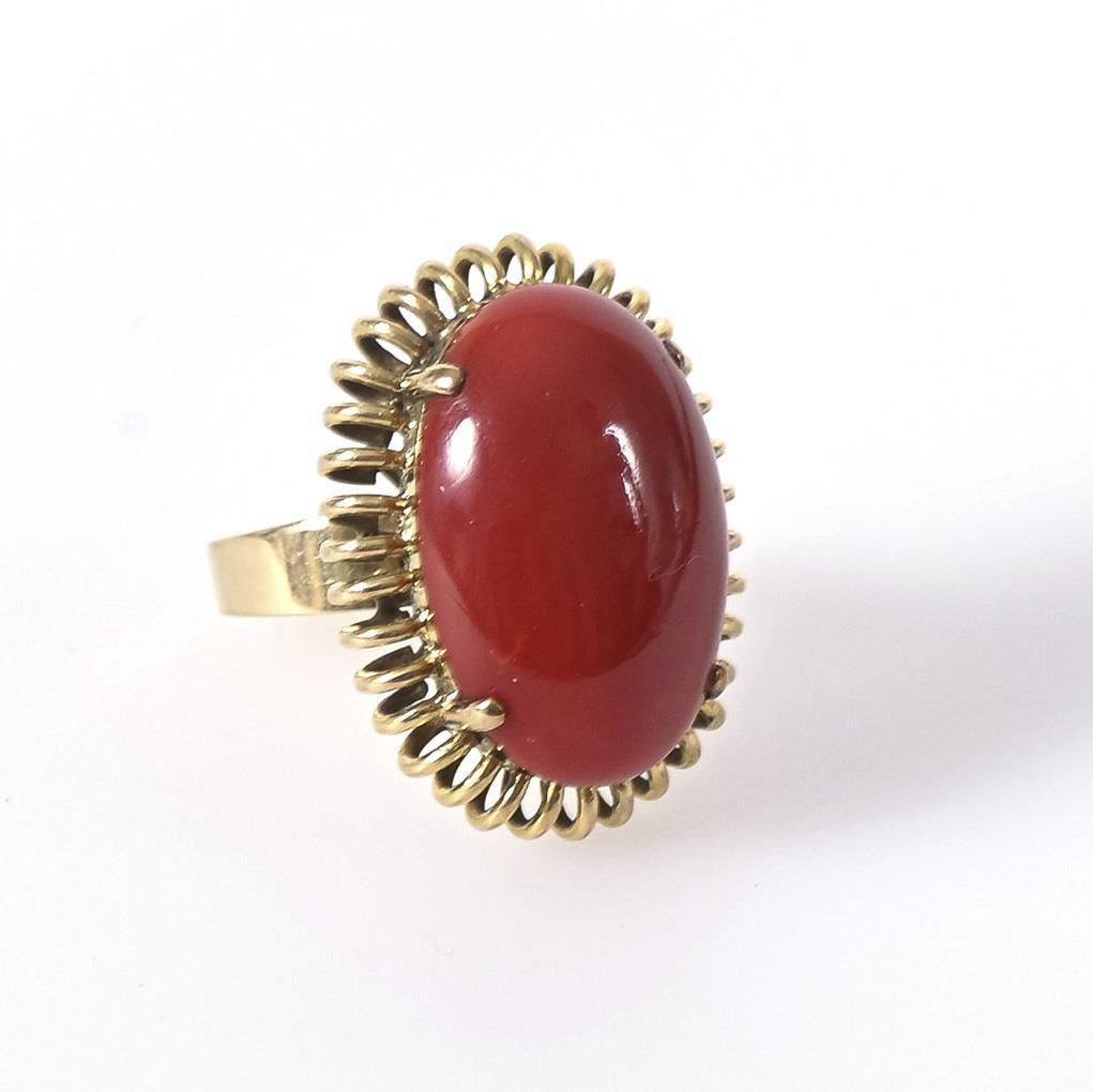 Gelbgold 585 gestempelt. Koralle 2,5 x 1,6 x 1 cm. Ringgröße 55. 13,6 g.