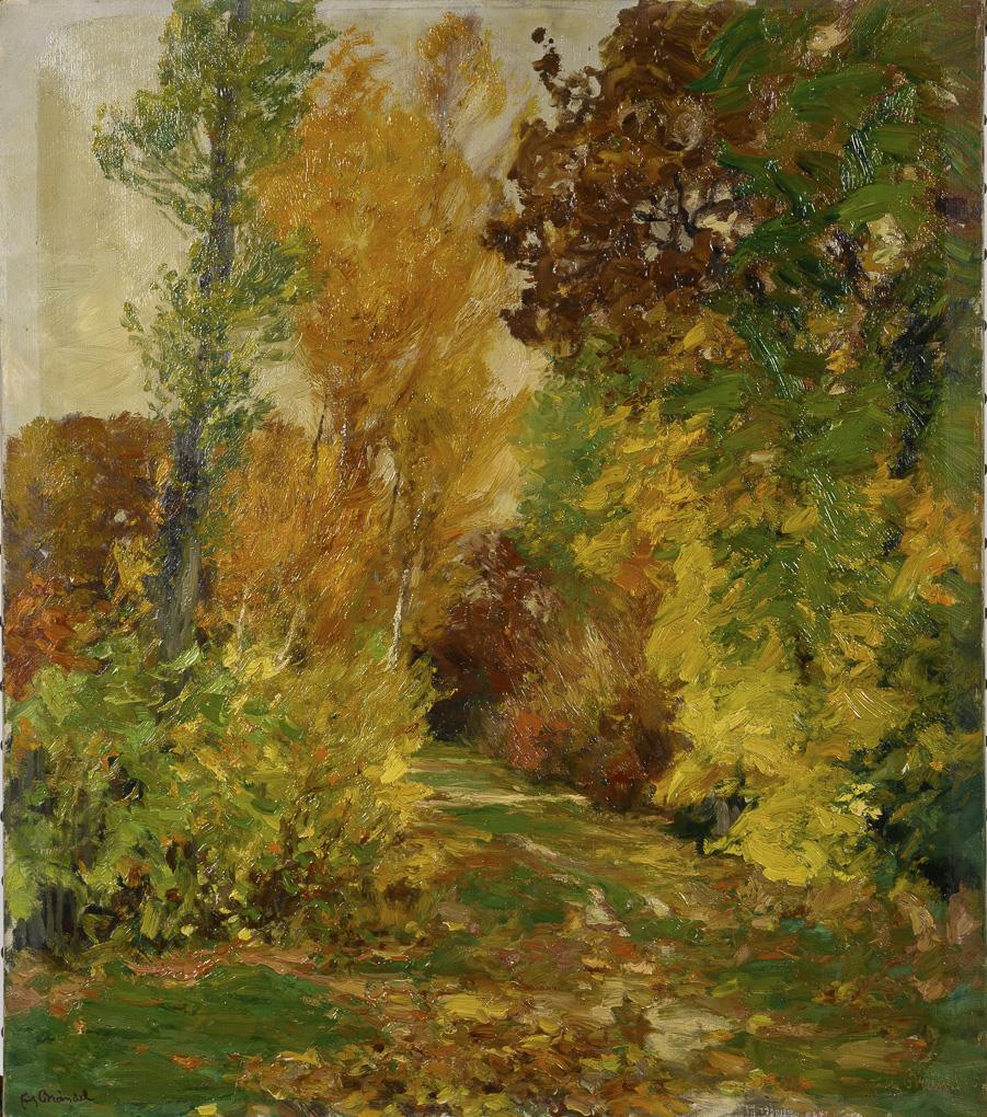 Impressionistische Waldlandschaft mit herbstlich verfärbten Bäumen.