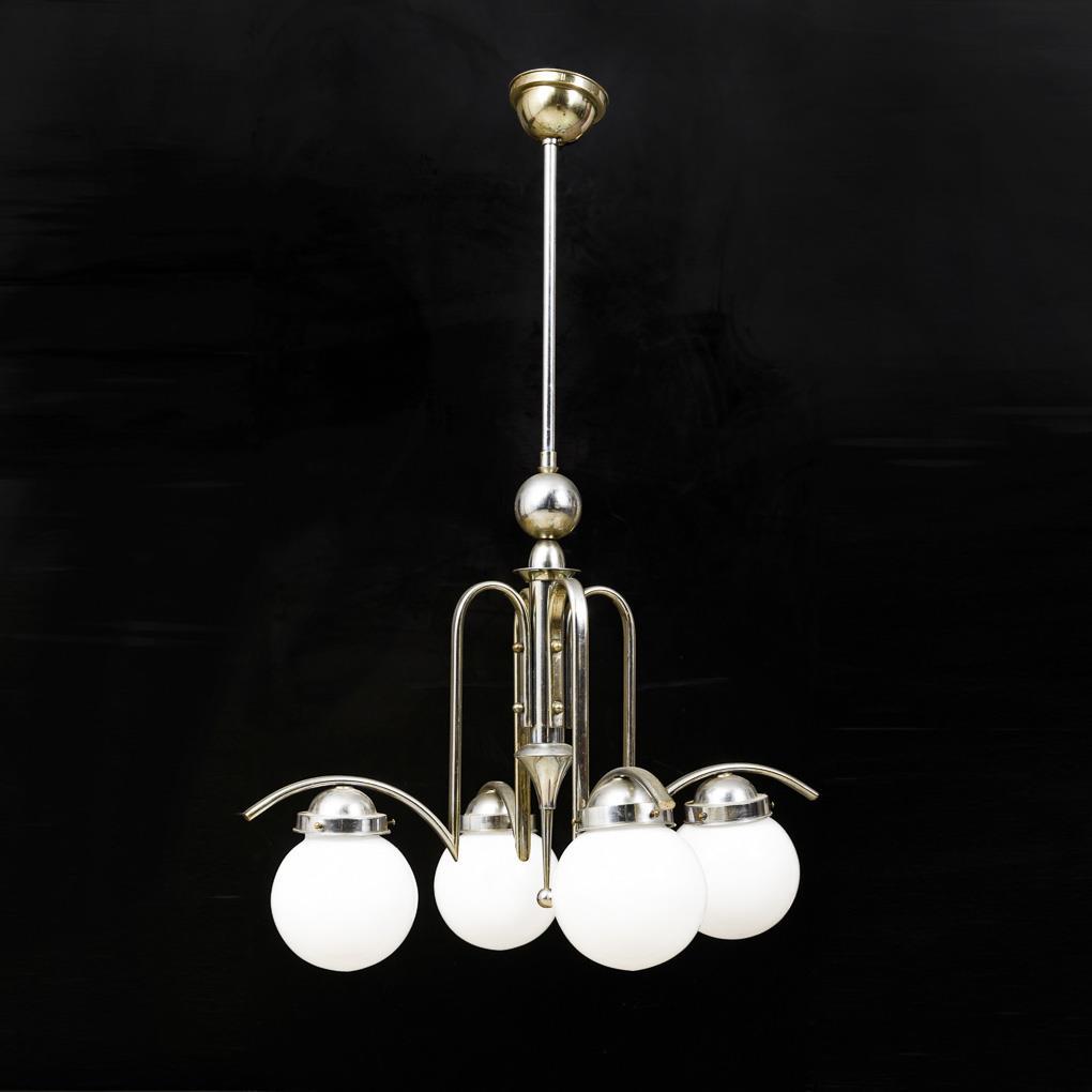 4-flammige Hängelampe an Mittelschaft mit Spitze, Zierkugel und Glockenbaldachin, 4 c-förmig geschwungene Arme mit Kugelschirmen. Gestell mit leichten Korrosionsspuren, 1 Glasschirm mit Chip am Rand.