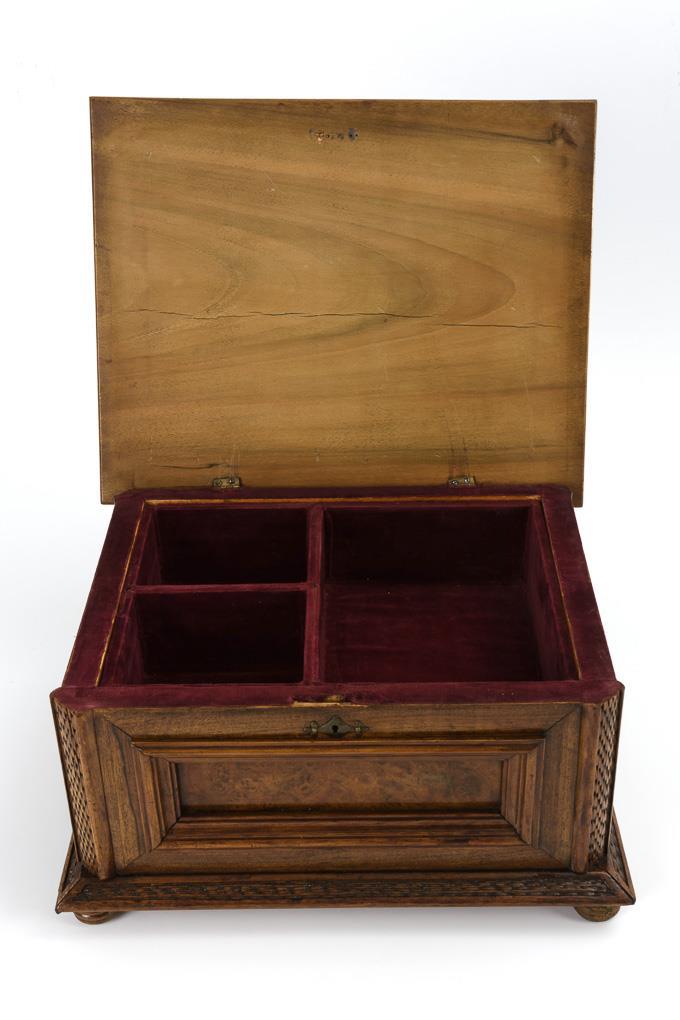 Quaderkorpus mit Kassettierungen in der Front und an den Seiten sowie gefräste Zierleisten in Flechtoptik. Innen herausnehmbare Fachung mit rotem Samt bezogen. Schloss fehlt, kaum Alters-/Gebrauchsspuren.