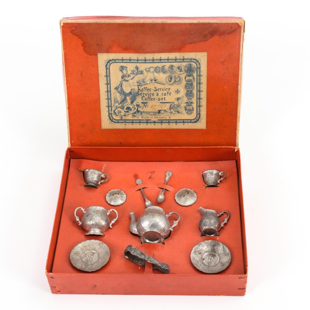 Floral reliefiertes, 12-teiliges Kaffeeservice für 2 Puppen. Unbespielt, mit Altersspuren.