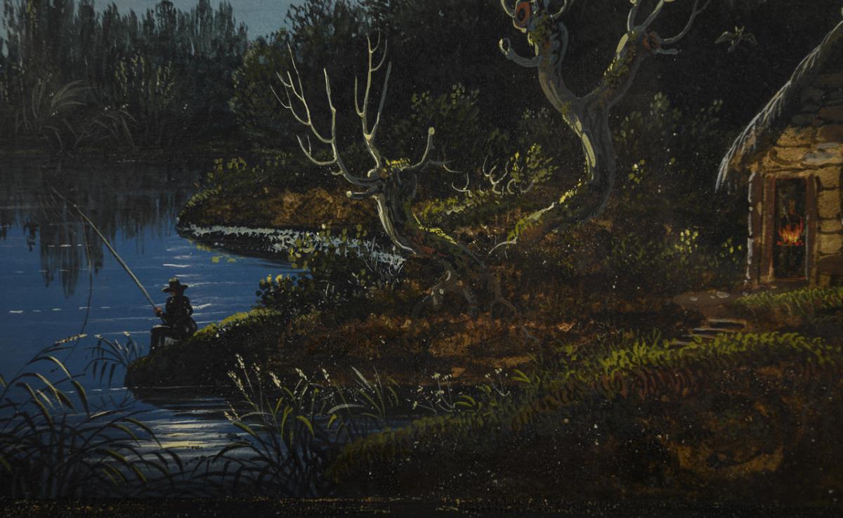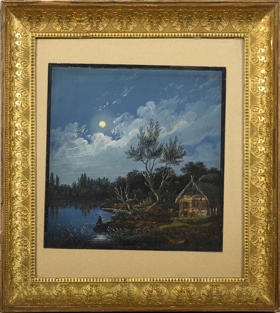 Der Angler am Flussufer bei hellem Mondschein nahe der Hütte am Waldrand.