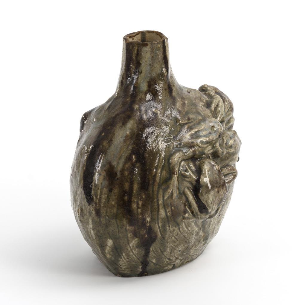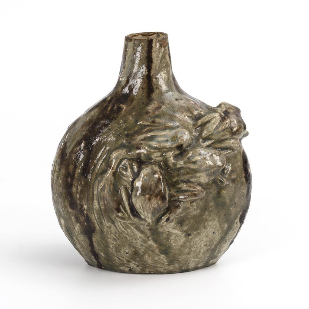 Organisch geformte Plattvase mit Enghals und plastischen Fröschen, die entlang der Wandung klettern. An Lippe restauriert, bodenseitig minimal bestoßen.