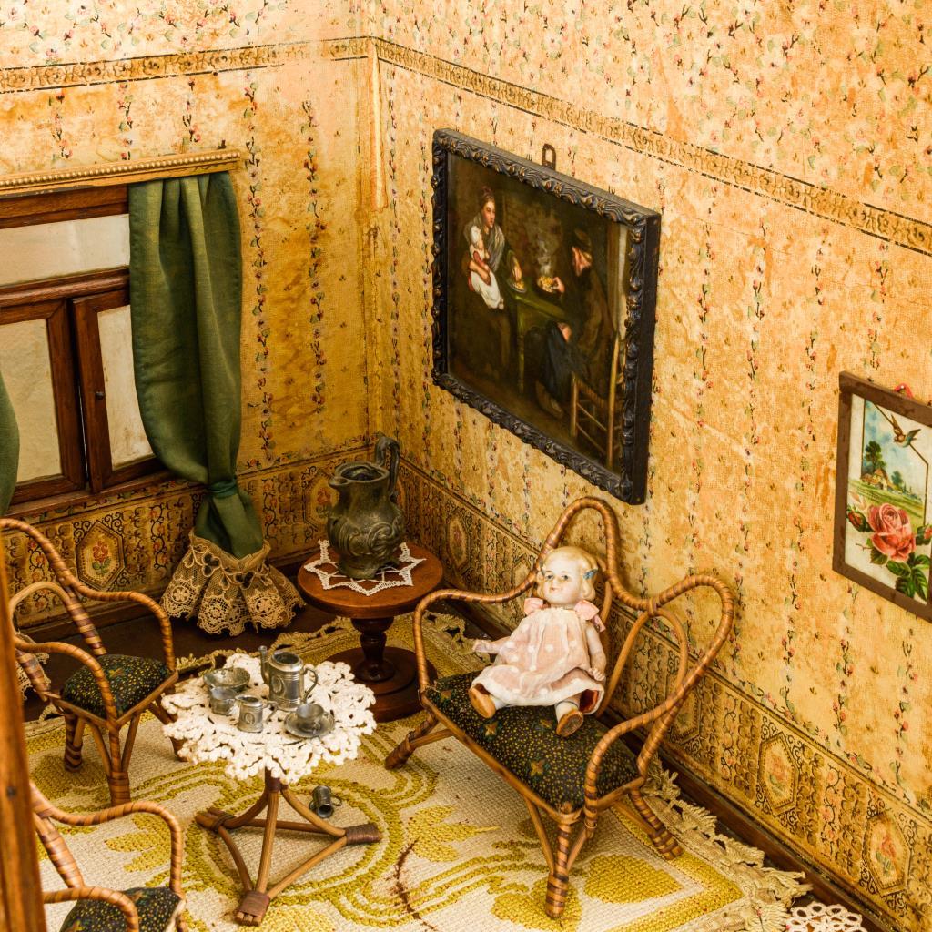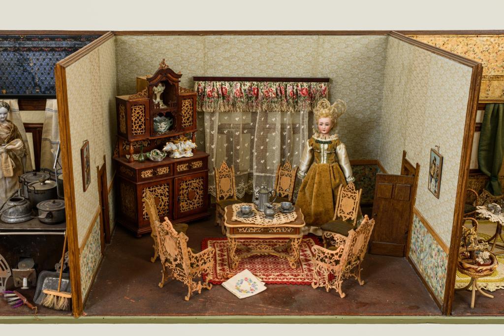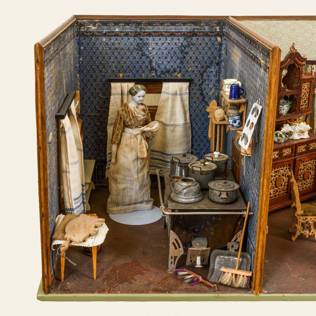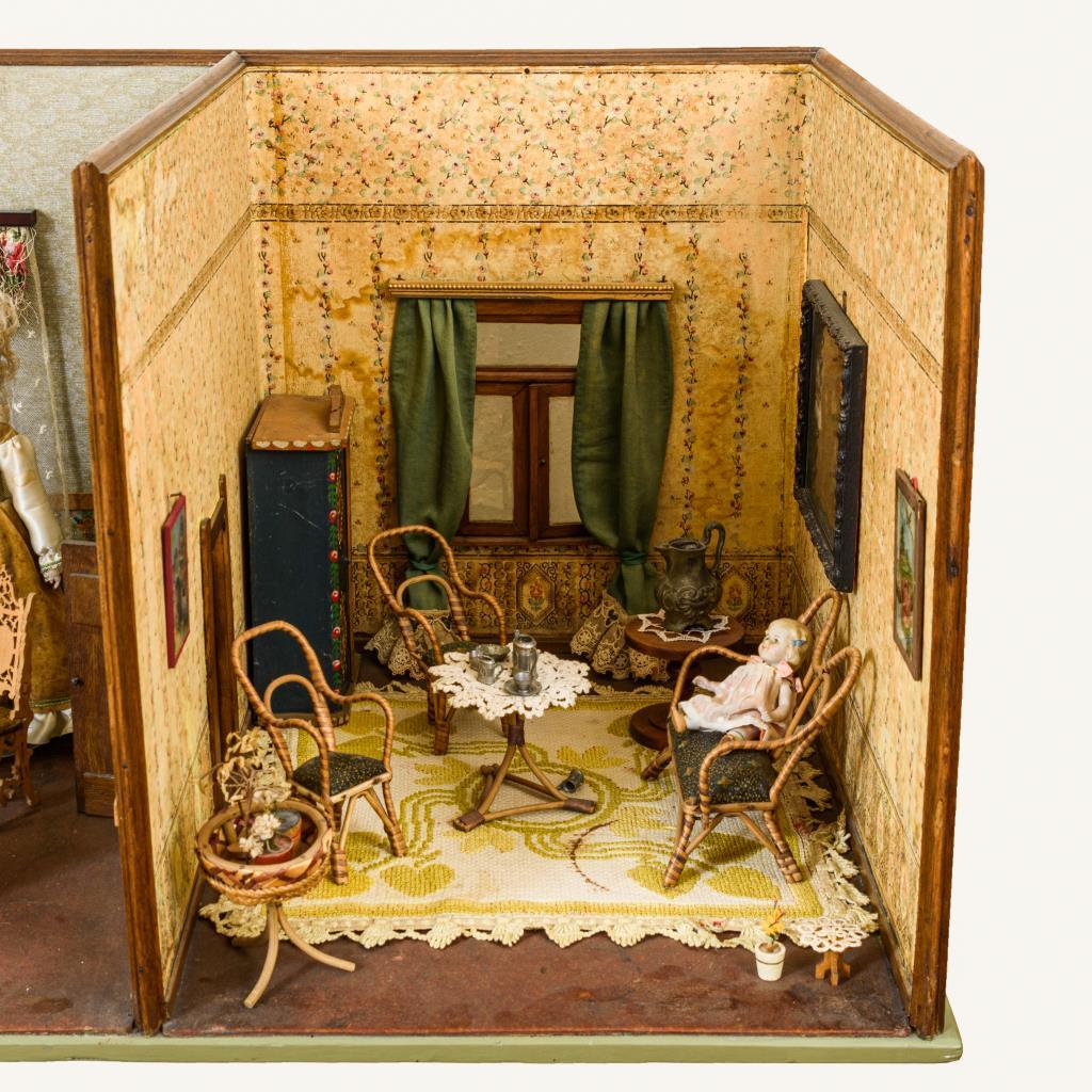 Mittig Salon mit Laubsägemöbeln, links Küche mit Blechherd, rechts Zimmer mit jüngeren Korbmöbeln und Bauernschrank. Dazu 3 Puppen mit Defekten bzw. aus alten Teilen zusammengebaut: 1x Biskuit, Simon & Halbig 1160, 1x mit glasiertem Brustkopf, 1x Ganzbiskuit, mit Sprung.