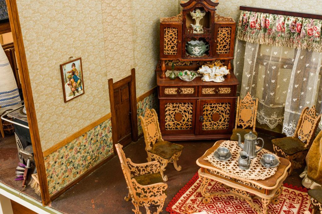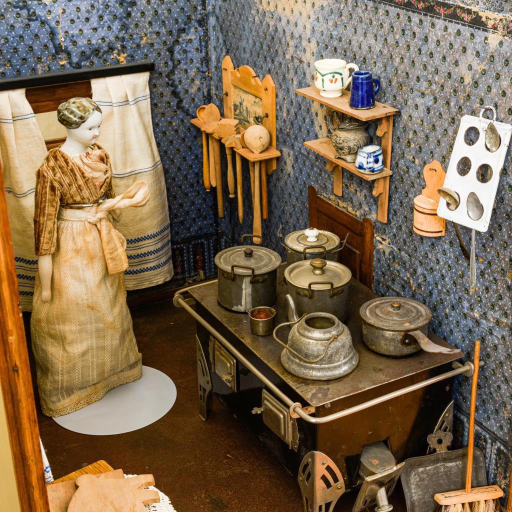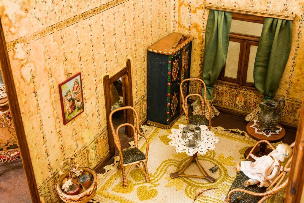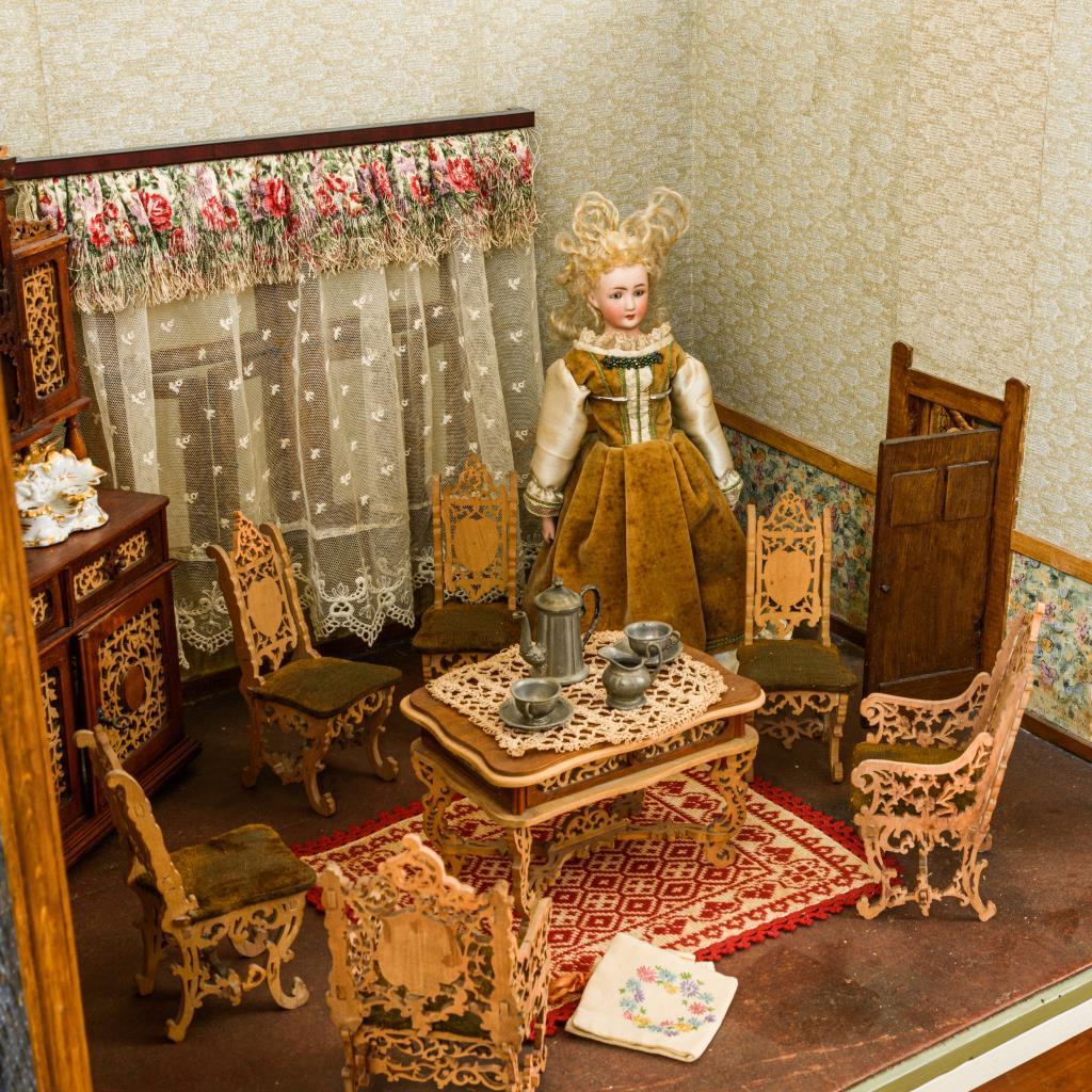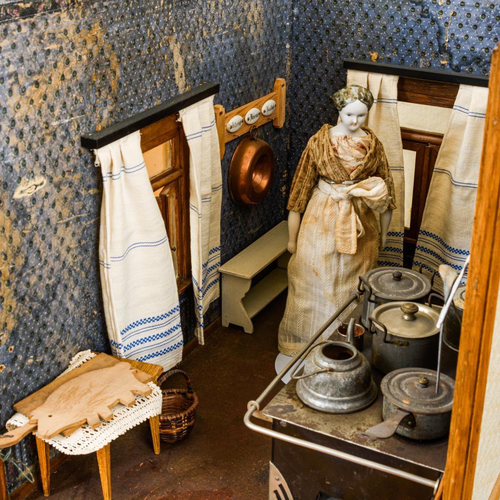 Mittig Salon mit Laubsägemöbeln, links Küche mit Blechherd, rechts Zimmer mit jüngeren Korbmöbeln und Bauernschrank. Dazu 3 Puppen mit Defekten bzw. aus alten Teilen zusammengebaut: 1x Biskuit, Simon & Halbig 1160, 1x mit glasiertem Brustkopf, 1x Ganzbiskuit, mit Sprung.