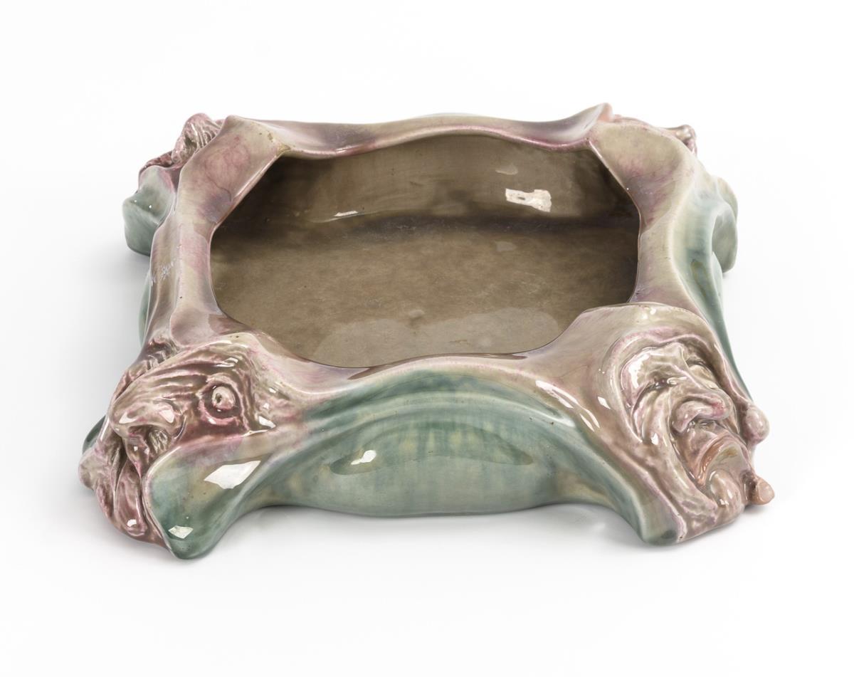 Flache quadratische Tafelschale, organisch geformt mit breiten reliefierten Ecken mit verschiedenen Gesichtern. Partiell minimale Glasurchips.