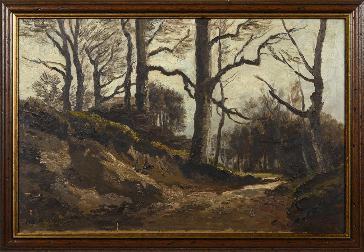 Waldweg zwischen kahlen Bäumen unter bedecktem Himmel. Leichte Altersspuren.