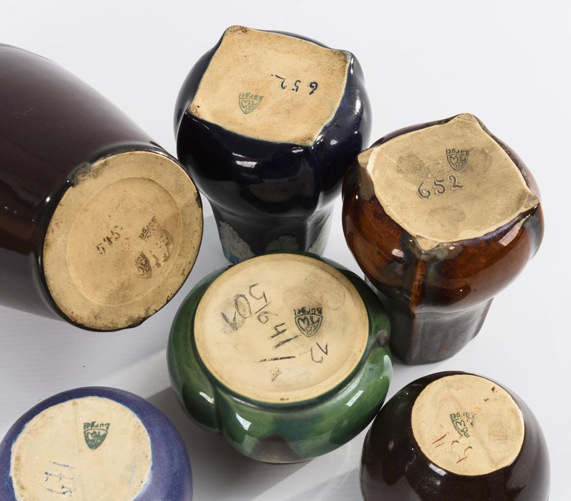 6 Jugendstil-Vasen. Bürgeler Kunstkeramische Werkstätte Carl Fischer.
