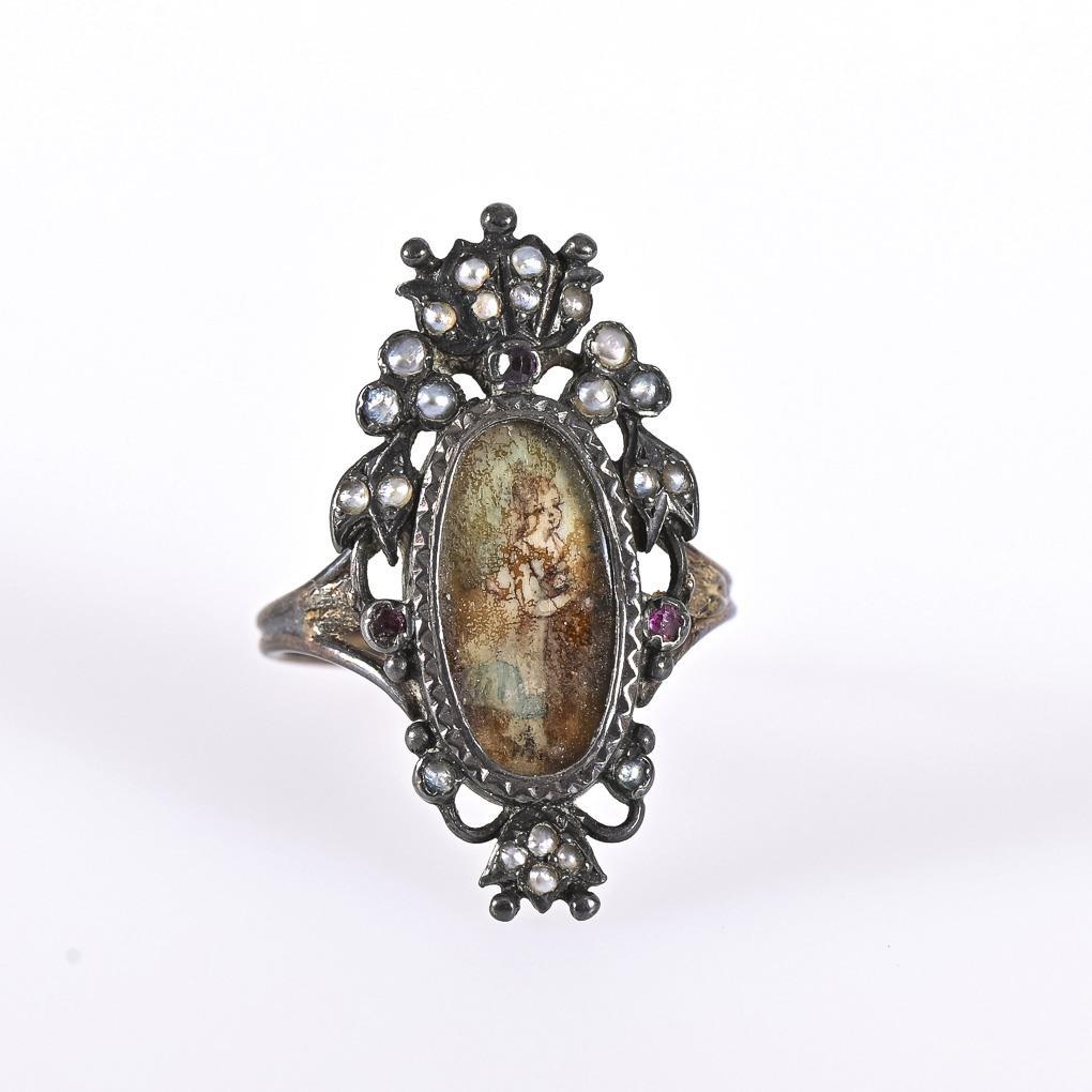 Kleine, verglast gerahmte Miniatur in Zierrahmen mit kleinen Rubinen und Perlchenbesatz. Schmale Schiene.