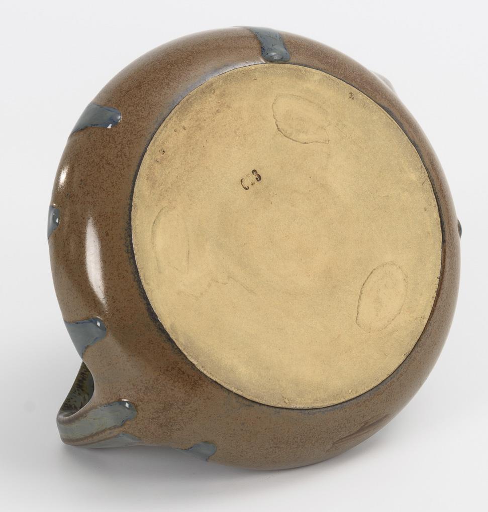Helles Steinzeug, taubenblaue Laufglasur auf braun gesprenkeltem Fond. H 12 cm.