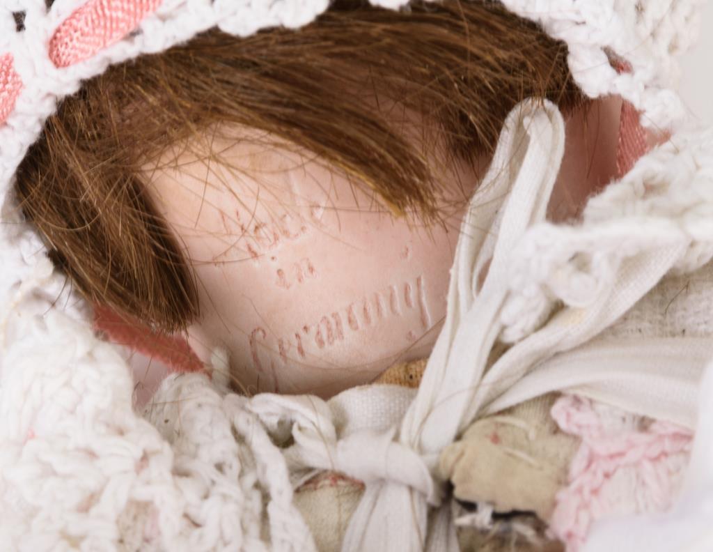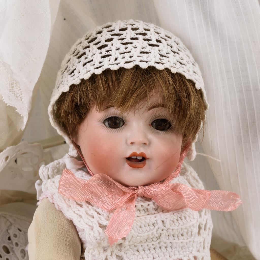 Weiß lackiertes Eisenbett mit weißem Bettzeug und abnehmbarem Himmel. Kleine Puppe mit Kurbelkopf, braunen Schlafaugen, Wimpern und festgeklebter Echthaarperücke. Fest gestopfter Stoffkörper mit Scheibengelenken. Weißes Kleid. Dazu Nachttopf aus Porzellan. Bett mit kleinen Farbdefekten.