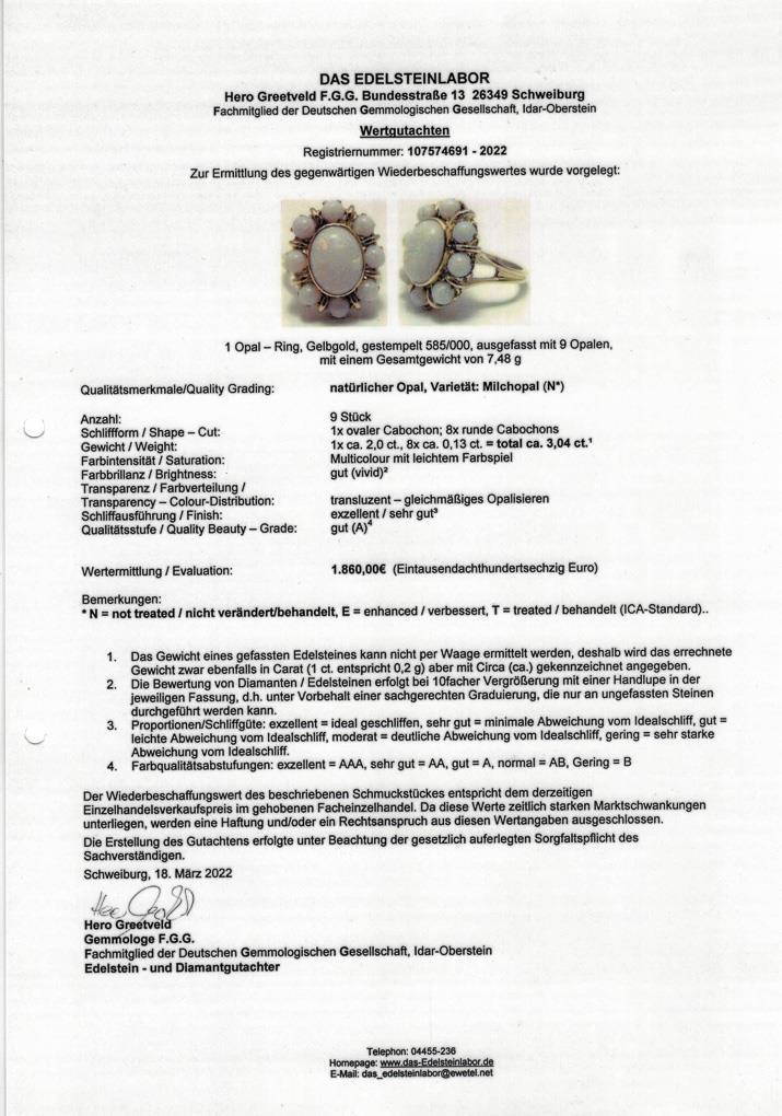 Gelbgold 585 gestempelt. Ringgröße 55. Opale gesamt ca. 3,04 ct. 7,3 g.