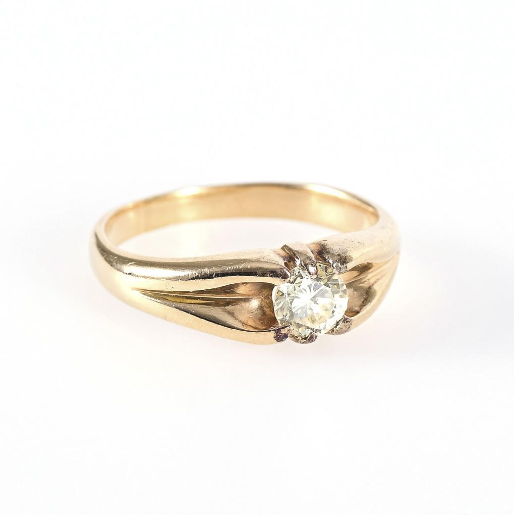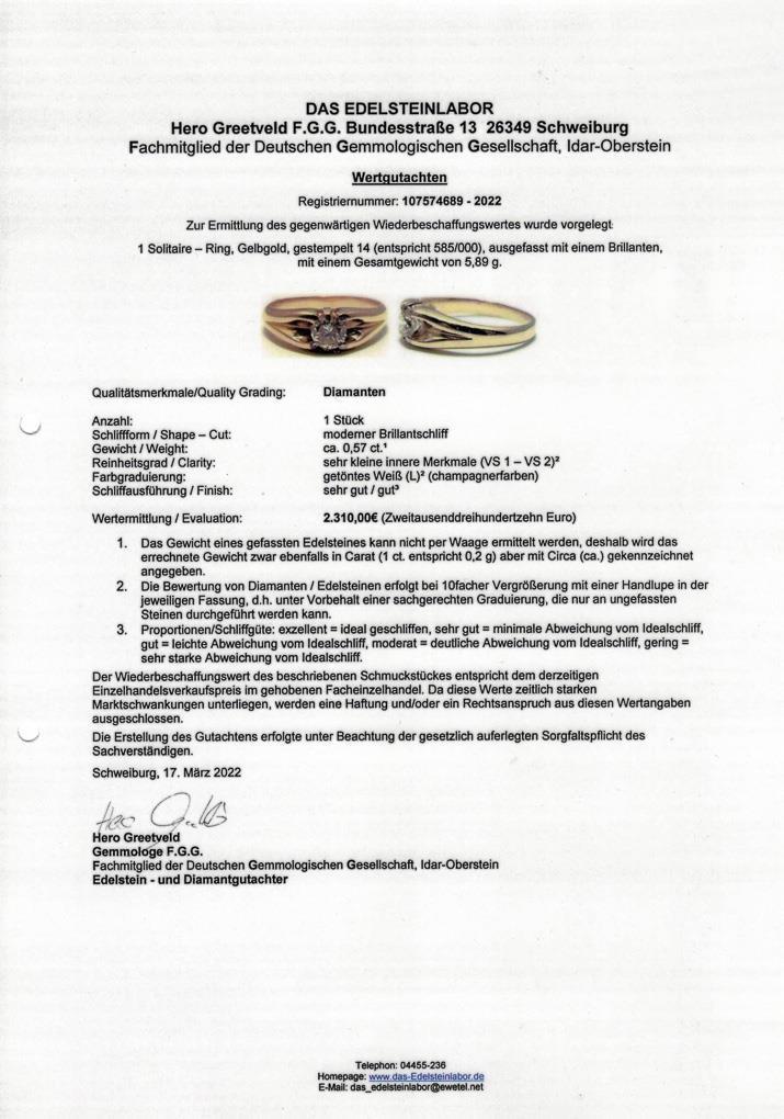 Gelbgold 14 gestempelt, 585 geprüft. Ringgröße 61. Brillant ca. 0,57 ct/L/vs1-vs2. 5,8 g.