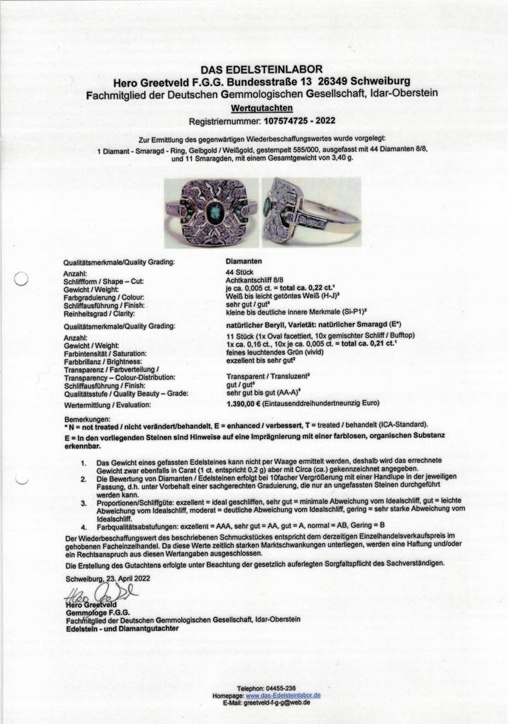 Gelbgold 14k gestempelt. Ringgröße 55. Diamanten gesamt ca. 0,22 ct/H-J/si-PI/Smaragde gesamt ca. 0,21 ct. 3,4 g.