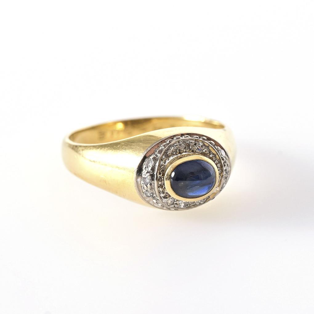 Gelbgold 750 gestempelt. Ringgröße 52. Saphir 1,04 ct/Diamanten gesamt 0,12 ct. 7,6 g.