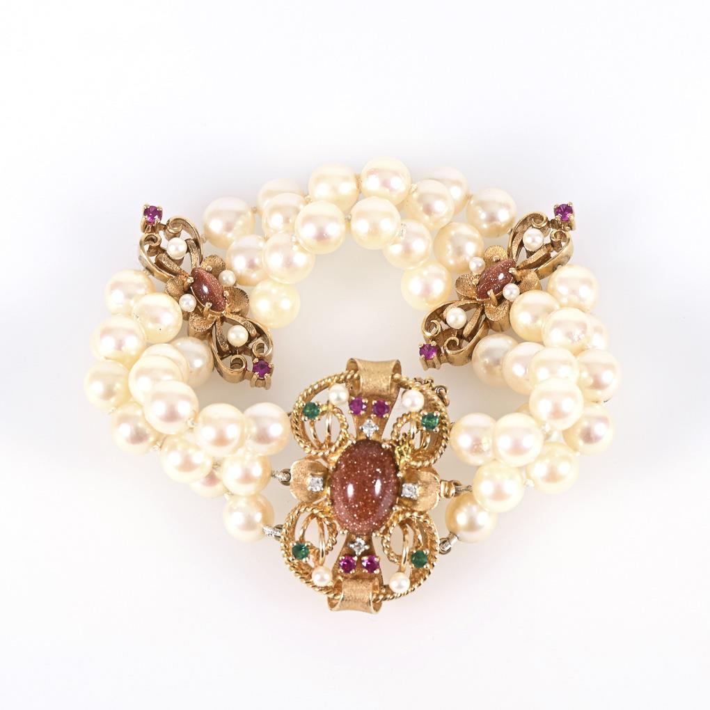 3 Schnürketten mit 54 Akoya-Zuchtperlen in Einzelverknotung. Großes Zierschloss, besetzt mit Goldfluss-Cabochon, 4 kleinen Brillanten, Farbsteinen und kleinen Zuchtperlen. 2 verzierte Zwischenstege, besetzt mit Goldfluss-Cabochon, Perlchen und Farbsteinen. Sicherheitskette.