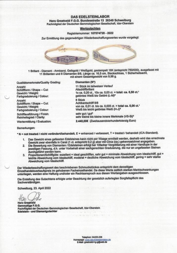 Gelbgold 18 ct gestempelt. L 16,5 cm. Brillanten gesamt ca. 0,50 ct/L-M. Diamanten gesamt ca. 0,06 ct/H-J/vs-si. 9,9 g.