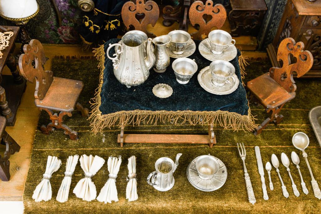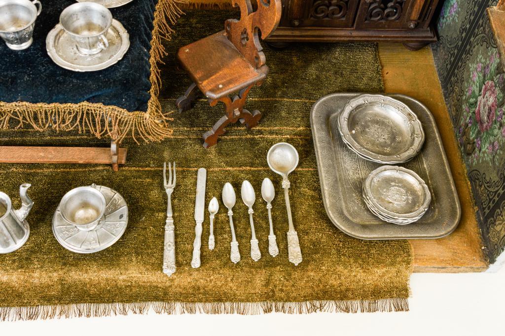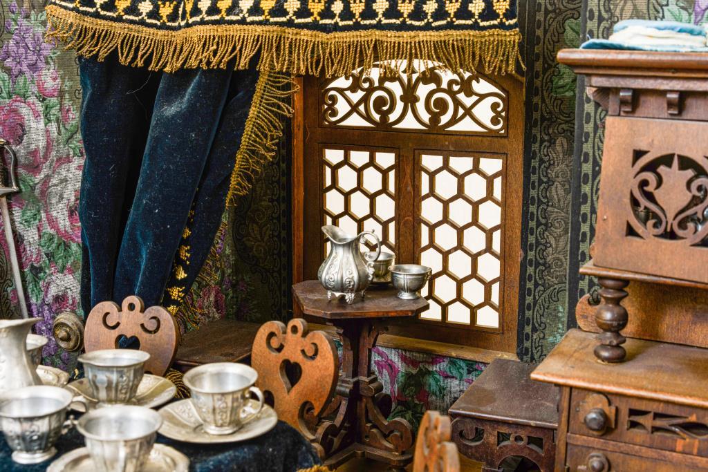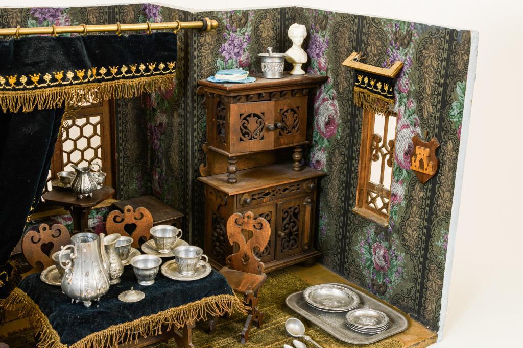 Holzgehäuse mit alten Tapeten: außen Ziegelpapier, innen dunkel gemustert. 11 Laubsägemöbel (wohl von Mey & Widmayer, München): Sitzgruppe, Konsolspiegel, großes Büfett, Erker mit 2 Bänken und Tisch. Dazu reiches Zinngeschirr mit Servietten. Defekte Petroleum-Standlampe ergänzt. Bestickte Samt-Schabracken.