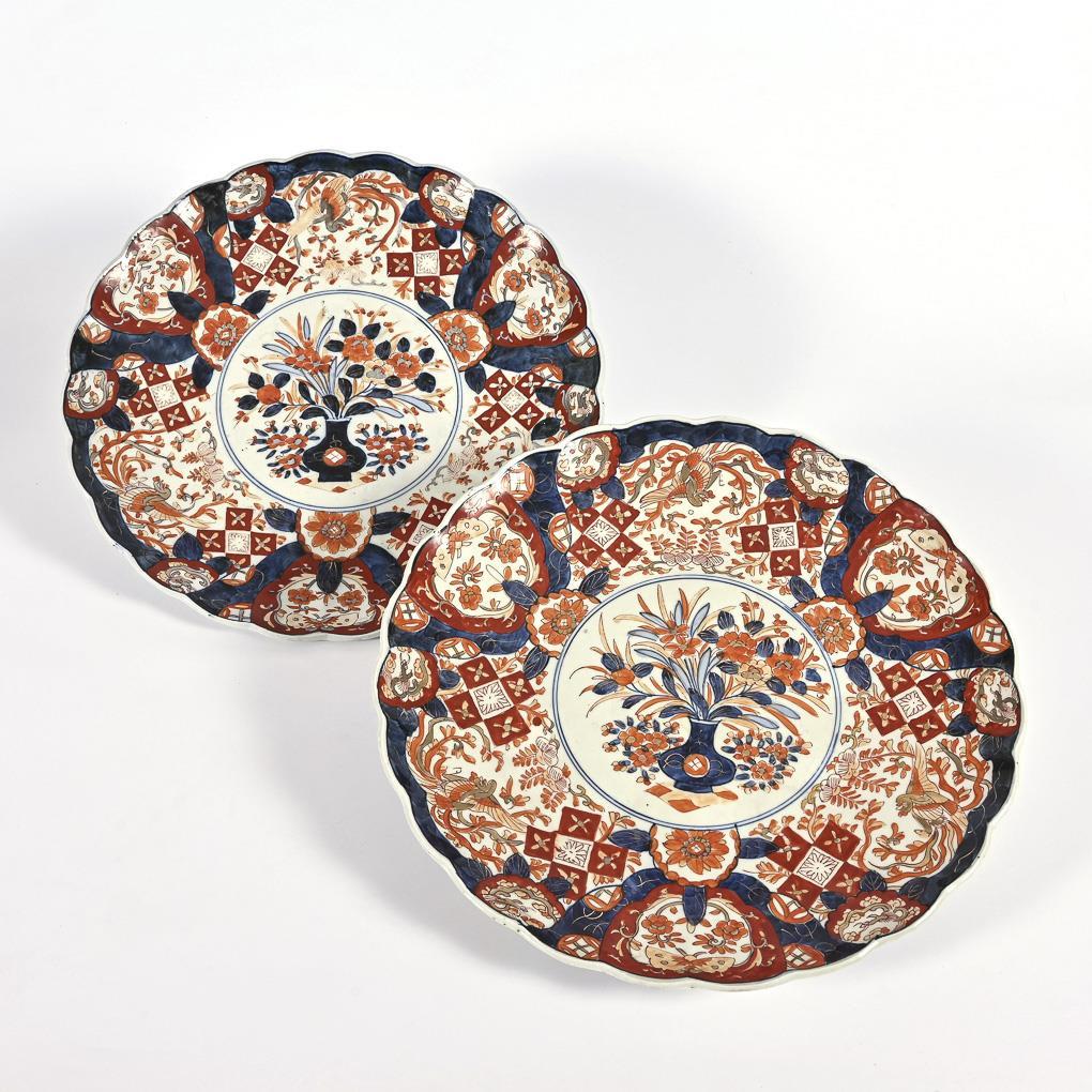 Paar große Imari-Wandteller mit Vasenmotiv.