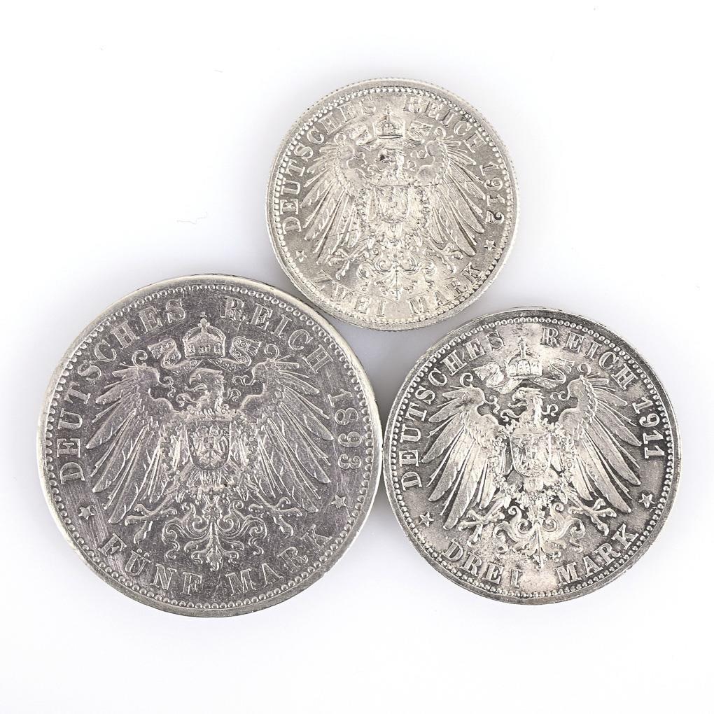 5 Mark, 1893, "Wilhelm II Koenig von Württemberg". / 3 Mark, 1911, "Wilhelm II und Charlotte von Württemberg 1886-1911". / 2 Mark, 1912, "Wilhelm II Koenig von Württemberg". Alle nach rechts blickend. Zustand: sehr schön bis fast vorzüglich.