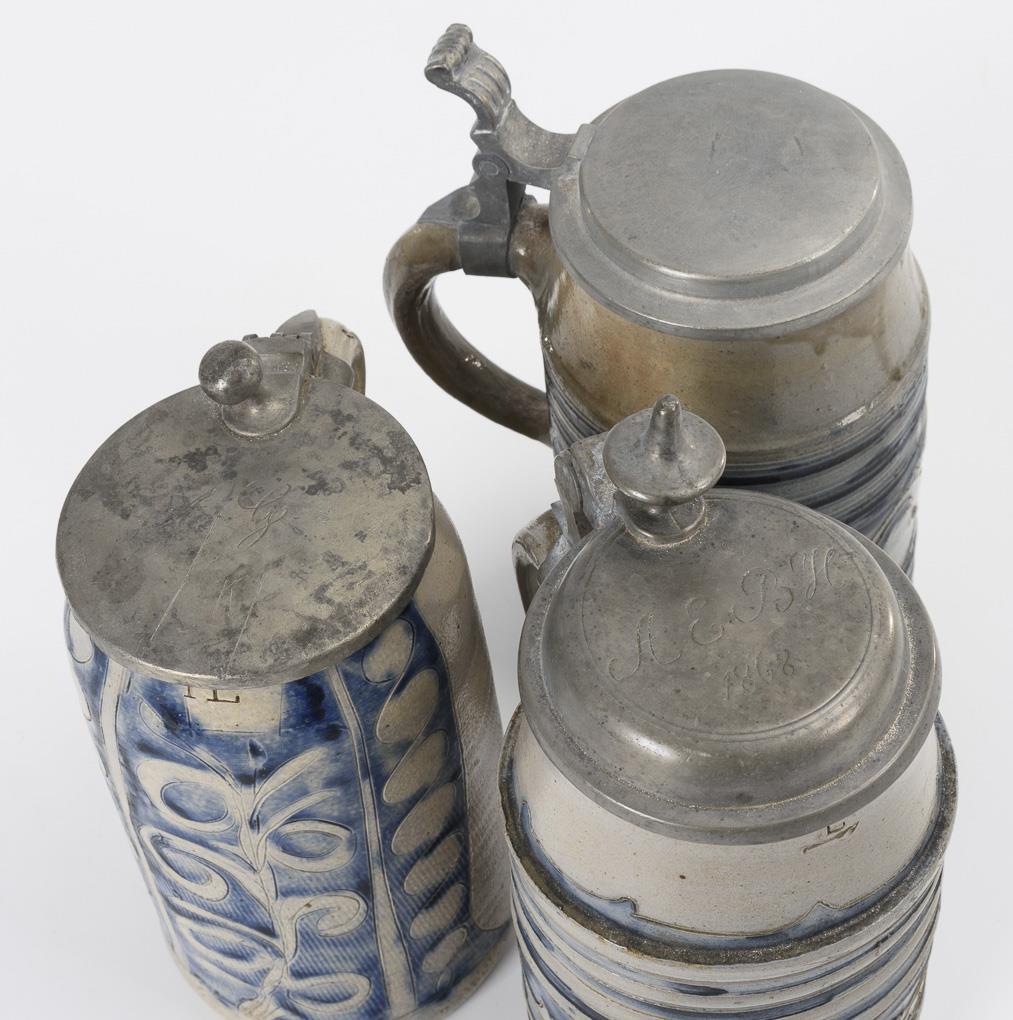 2 Walzenkrüge mit Querrillen und Blattranken, 1 Krug mit vertikalen Ranken und Zopfbändern. Jeweils mit Zinndeckel, teils graviert. Minimale Alters- und Gebrauchsspuren.