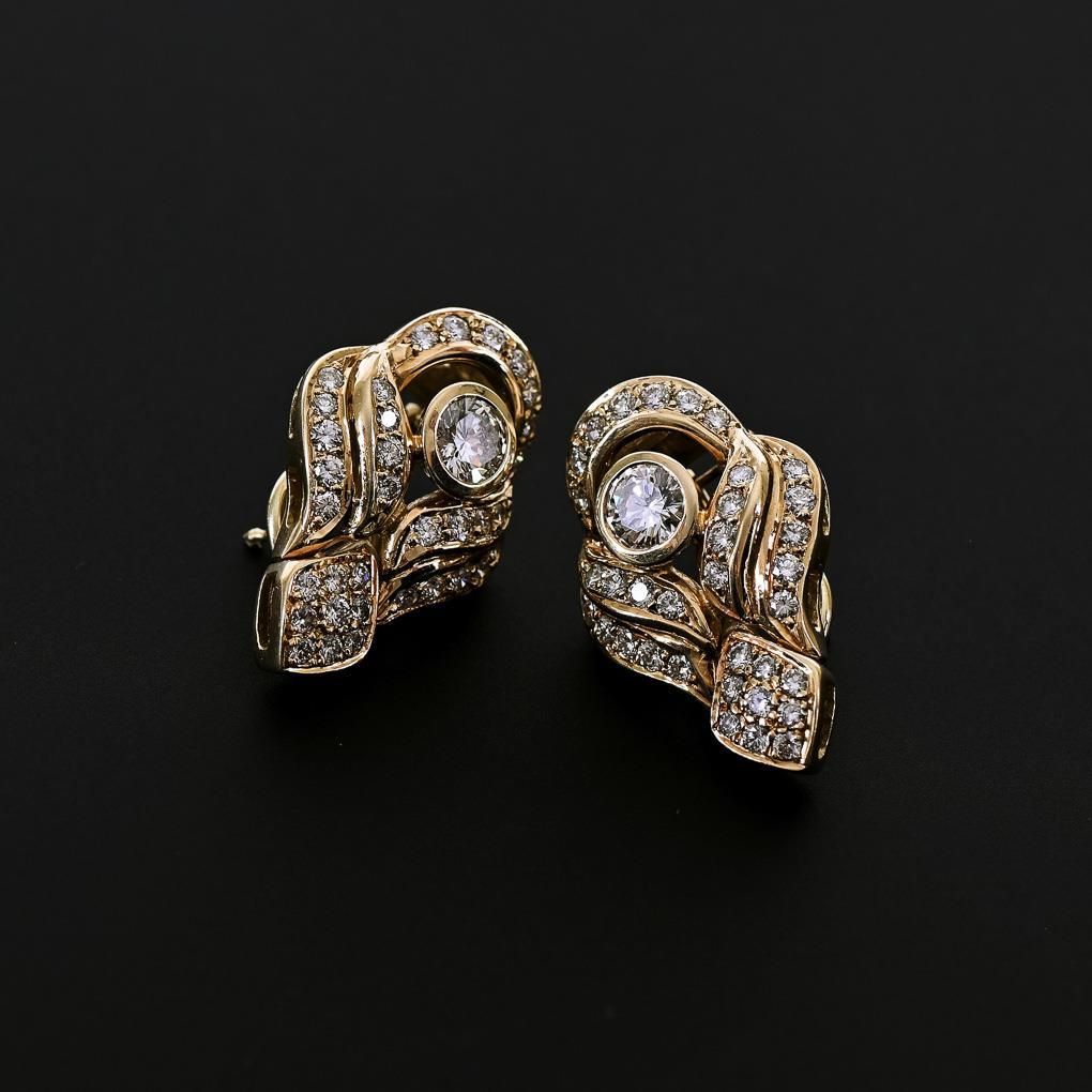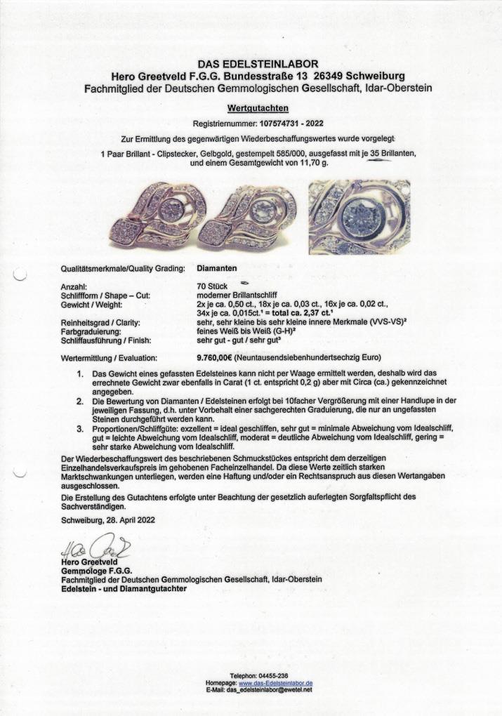 Gelbgold 585 gestempelt. 2,7 x 1,8 cm. 2 Brillanten gesamt ca. 1,00 ct. 68 Brillanten gesamt ca. 1,37 ct/G-H/vvs-vs. 11,7 g.
