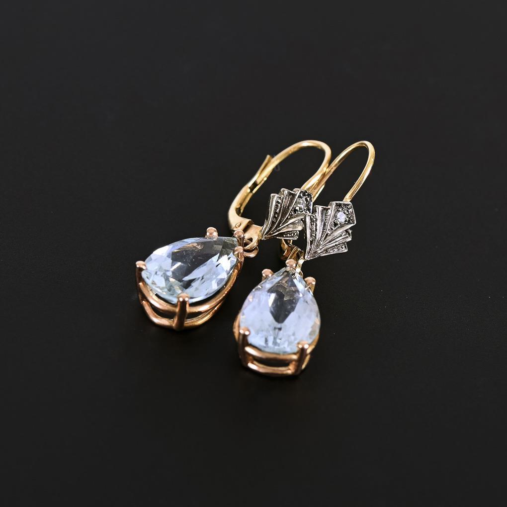 Roségold 585 gestempelt/Gelbgold 585 geprüft. L 3,5 cm. Aquamarine gesamt ca. 7,20 ct. 5,7 g.