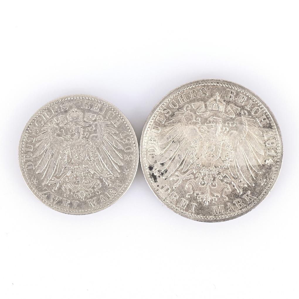 3 Mark, Bayern, 1914, "Ludwig III. Koenig von Bayern". / 2 Mark, Sachsen, 1902, "Albert Koenig von Sachsen". Zustand: vorzüglich.