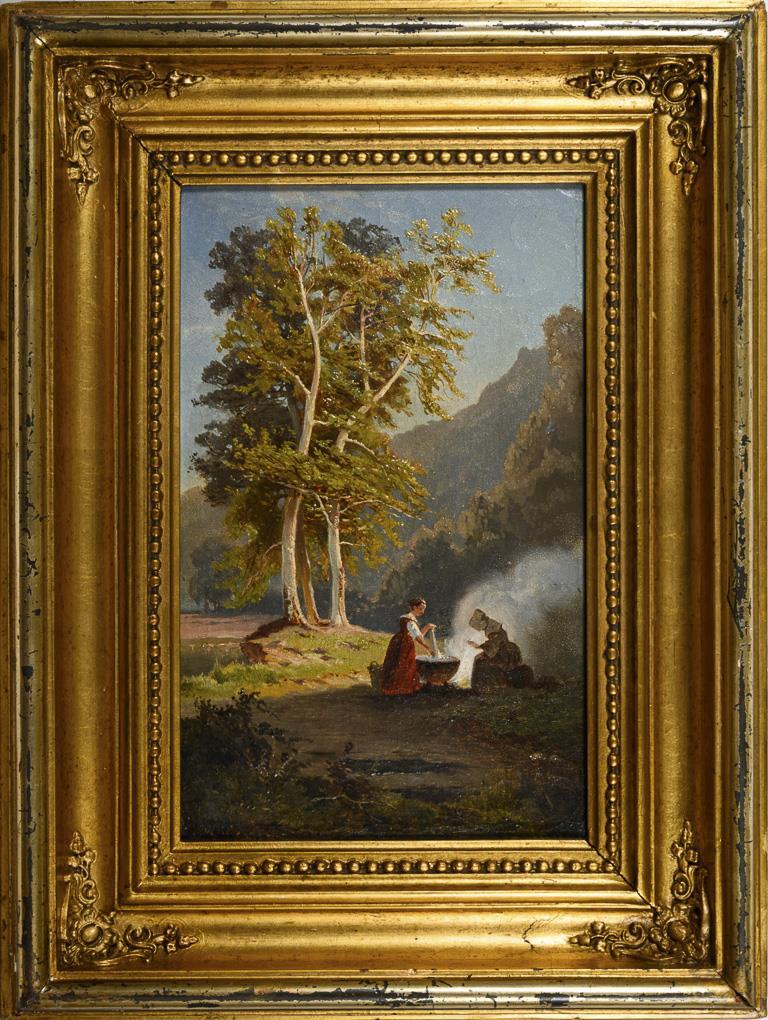 Zwei Frauen an einem Feuer mit Kessel im bergiger Landschaft im Sonnenschein. Minimale Altersspuren.