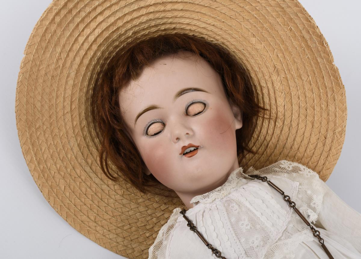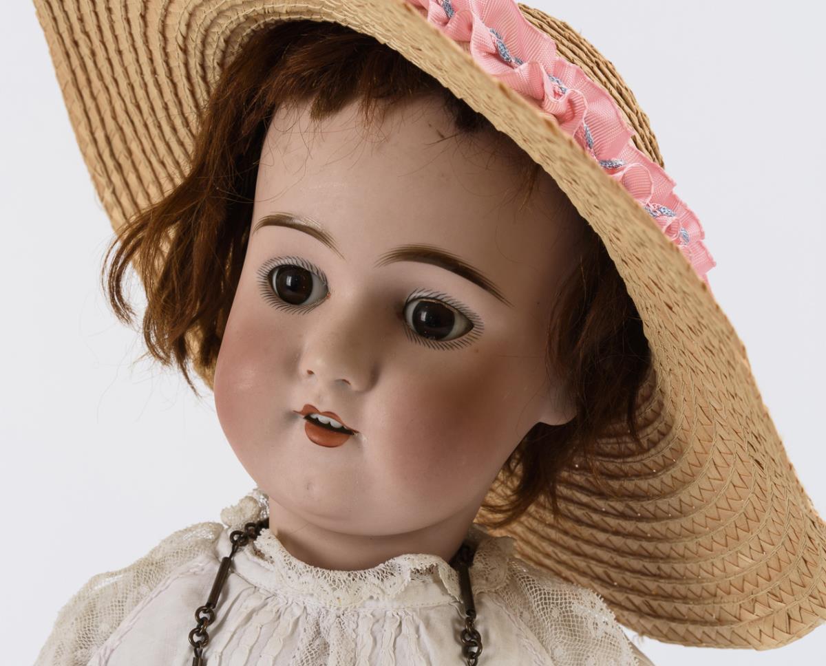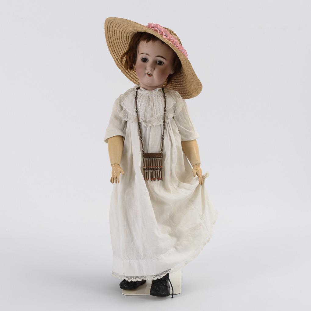 Kurbelkopf, braune Schlafaugen, rotbraune Mohairperücke. 15-teiliger Gliederköper mit vermutlich alt ergänztem Unterschenkel. Weißes Kleid, Strohhut, lange Kupferkette, schwarze Schuhe. Kopf durchleuchtet: ohne Defekte.