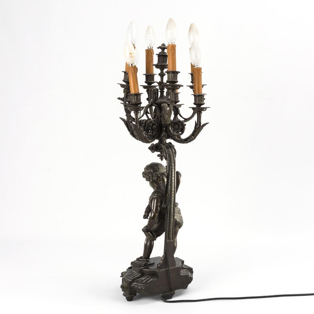 Prächtiger Sockel; in der Front applizierte Prunkkartusche mit Instrumenten. Vollplastische Figur der Herkulesknaben mit Löwenfell und Musikinstrumenten. Prachtvoller Aufsatz mit 8 gestuften Armen und Schraubfassungen mit Papp-Kerzenhülsen. Funktioniert, jünger verkabelt. 1 kleine Metall-Fehlstelle, 1 Arm locker.