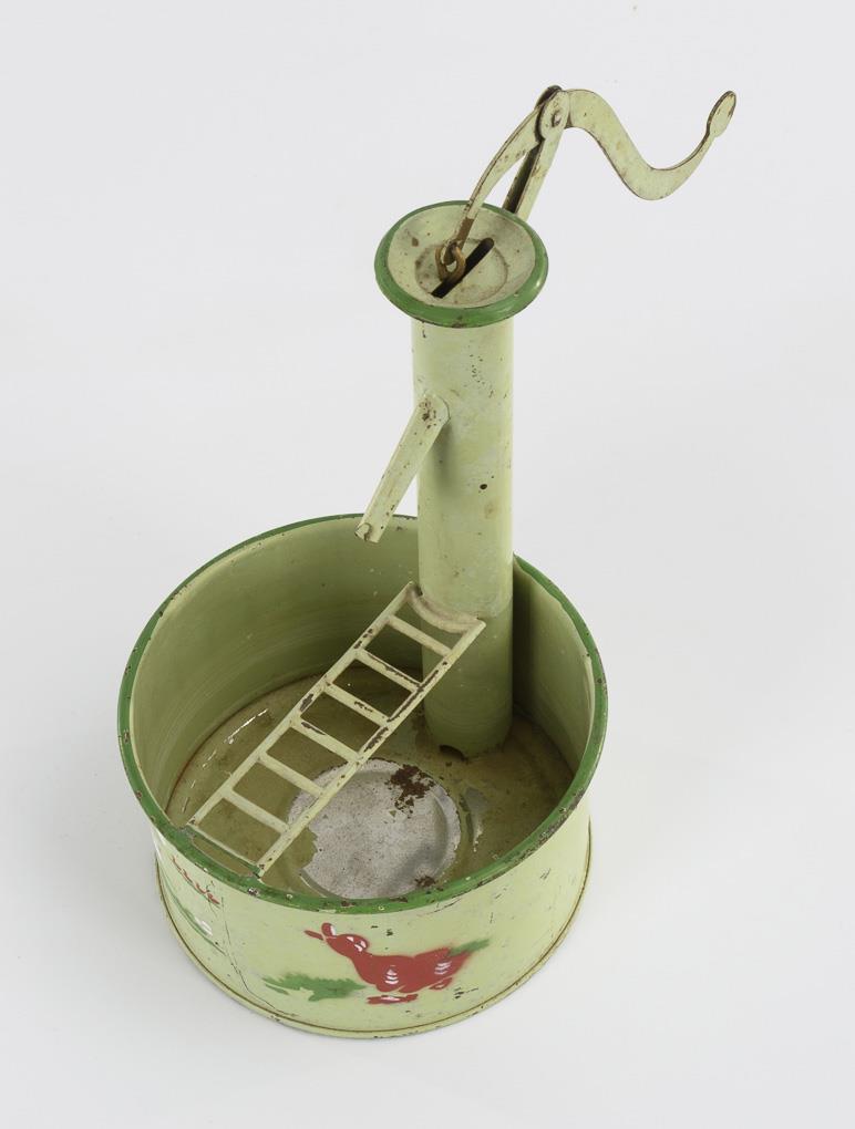 Bahnsteig mit beweglicher Figur und Eisenbahn-Stellwerk "W-54", beide Heinrich Wimmer, Nürnberg./ Traktor mit Hänger "TCO 65", Tipp & Co, Nürnberg./ Eisenbahn-Signal und Brunnen mit Handpumpe, beide ungemarkt. Bespielt, mit Altersspuren und Lackdefekten.