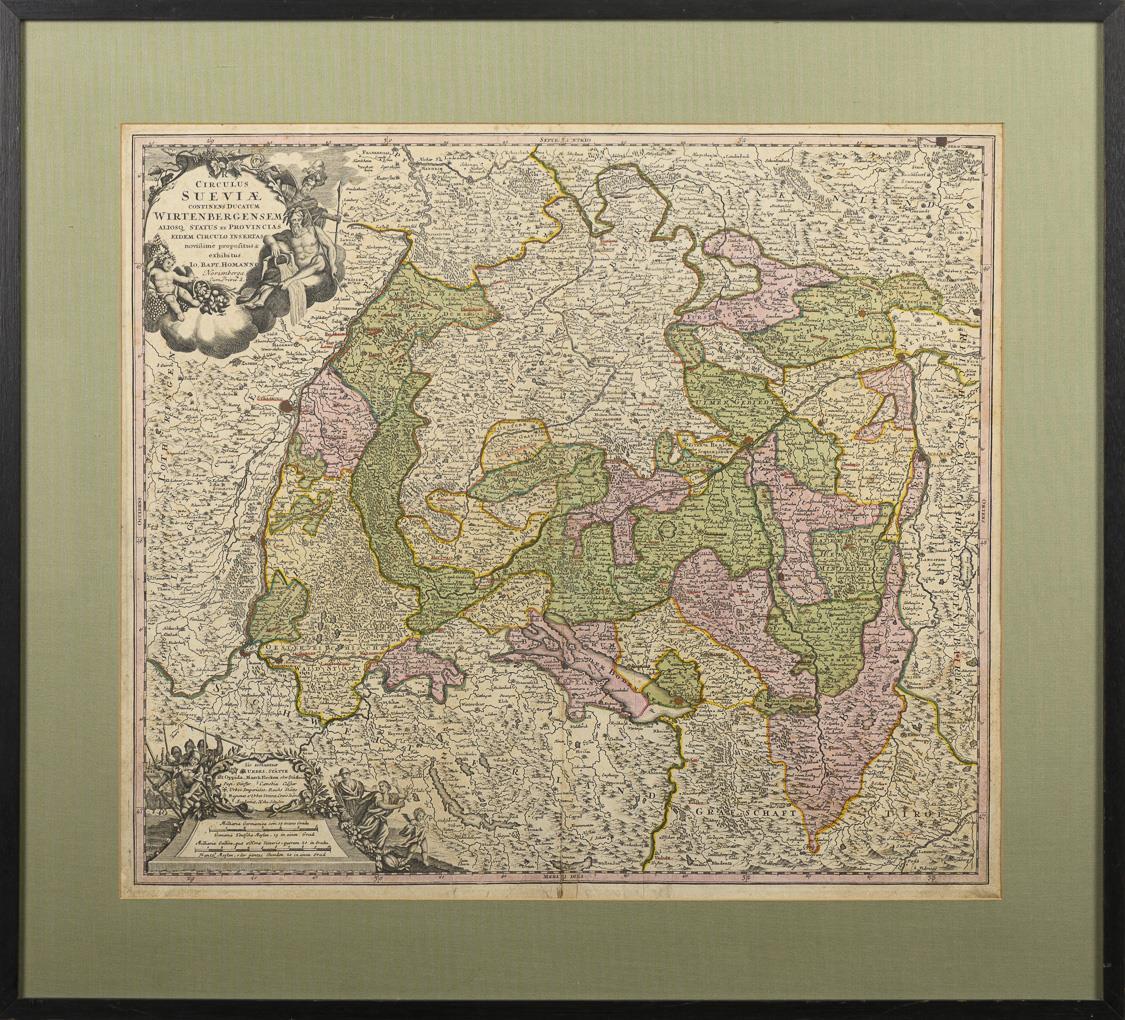 Detailreiche historische Karte des Herzogtums Württemberg und des Schwäbischen Kreises, figürliche Titelkartusche "Circulus Sueviae Continens Ducatum Wirtenbergensem [...]" und weiterer figürlicher Kartusche mit Legende und Meilenzeiger. Stockfleckig, Bugfalte, griff- und knickspurig.