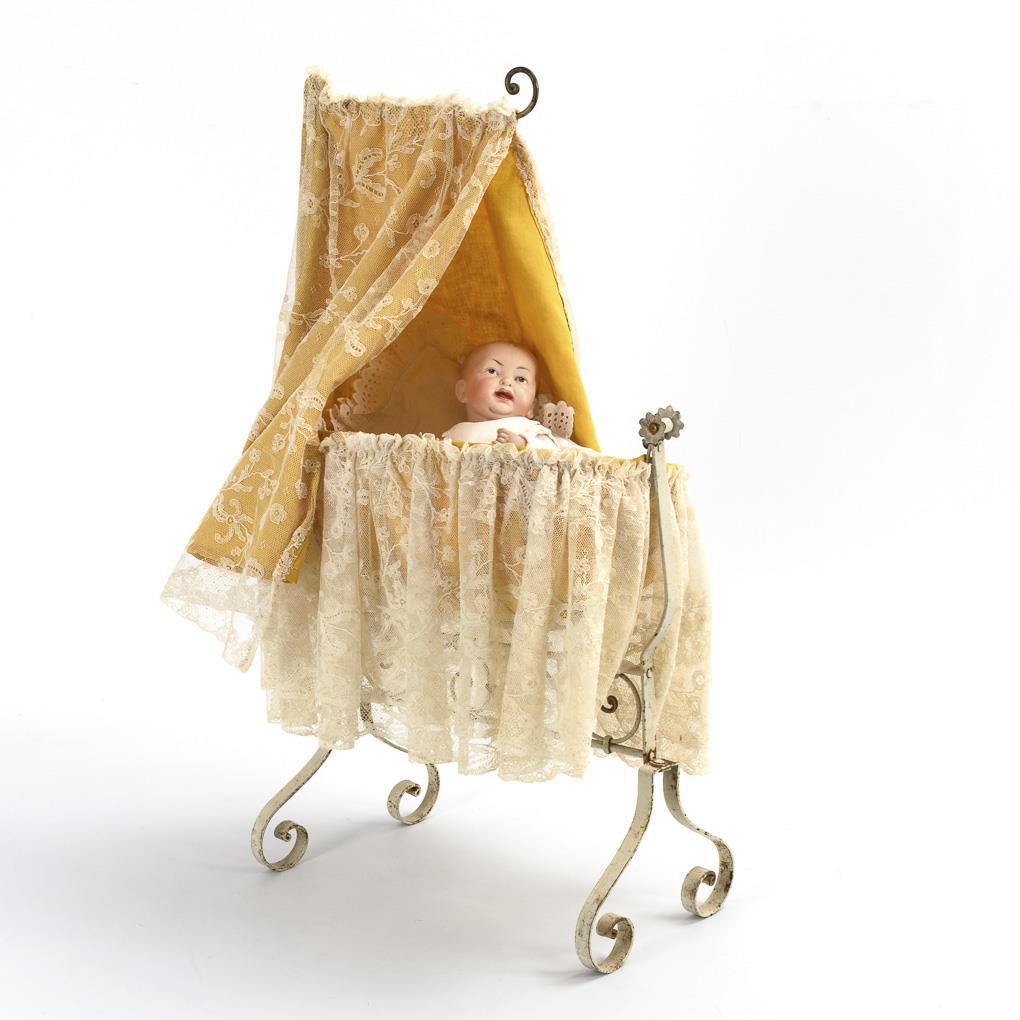 Vollkopfbaby mit gemalten braunen Augen, offen-geschlossenem Mund und gestrichelten Babyhaaren, Körper und Arme aus Biskuit, ergänzte Massebeine. In weißer Babykleidung. Halskurbel und oberer Rücken repariert. L 28 cm. / Weiße Metallwiege mit Himmel, gelbem Stoff und Spitze. Altersspuren und etwas Rost. 66 x 20 x 40 cm.