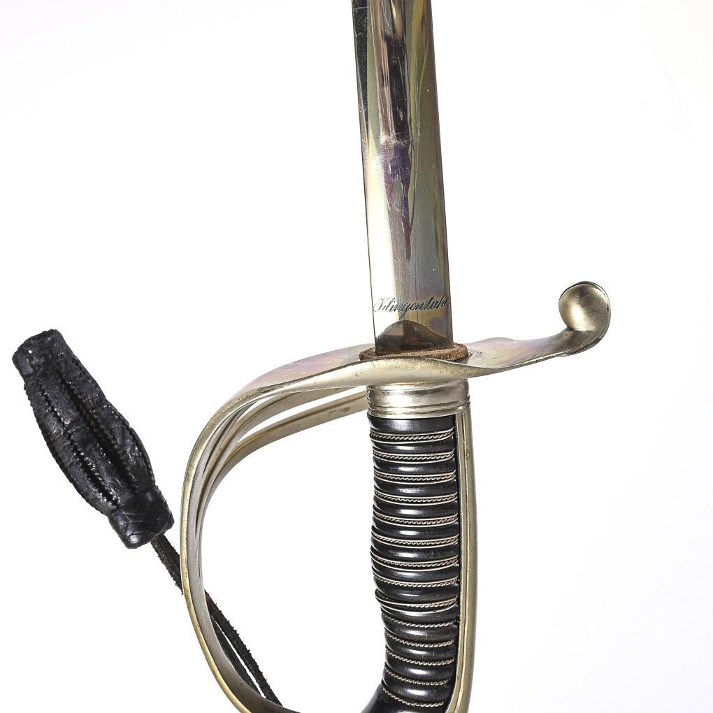 Sehr gut erhaltene, ungeschliffenen Klinge mit seitlich versetztem Hohlschliff und Spitze in der Mittellinie. Vierspangiger Faustschutz. Metallscheide mit einer beweglichen Öse. Drahtwicklung am Griff etwas unvollständig. Scheide mit Nutzungsspuren.
