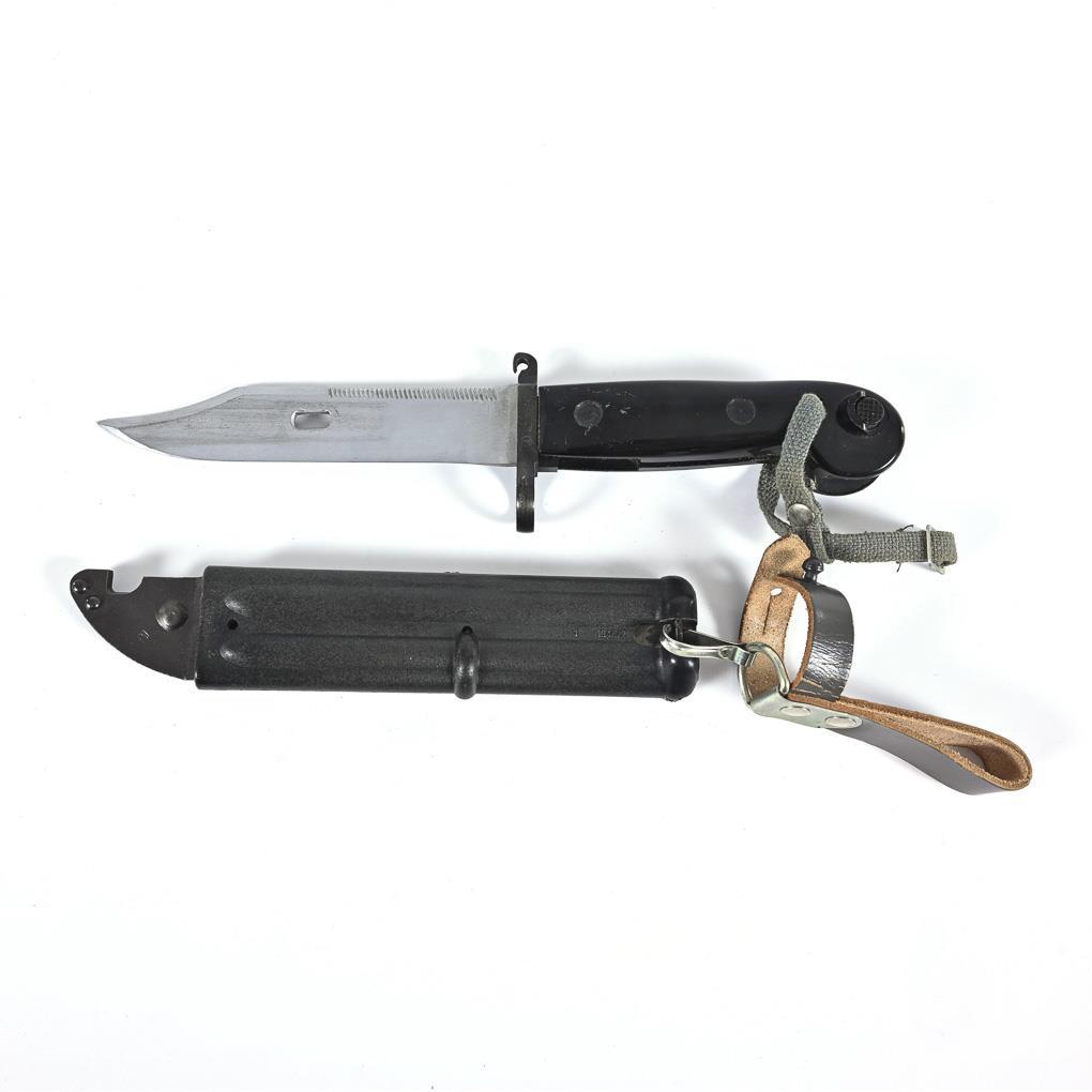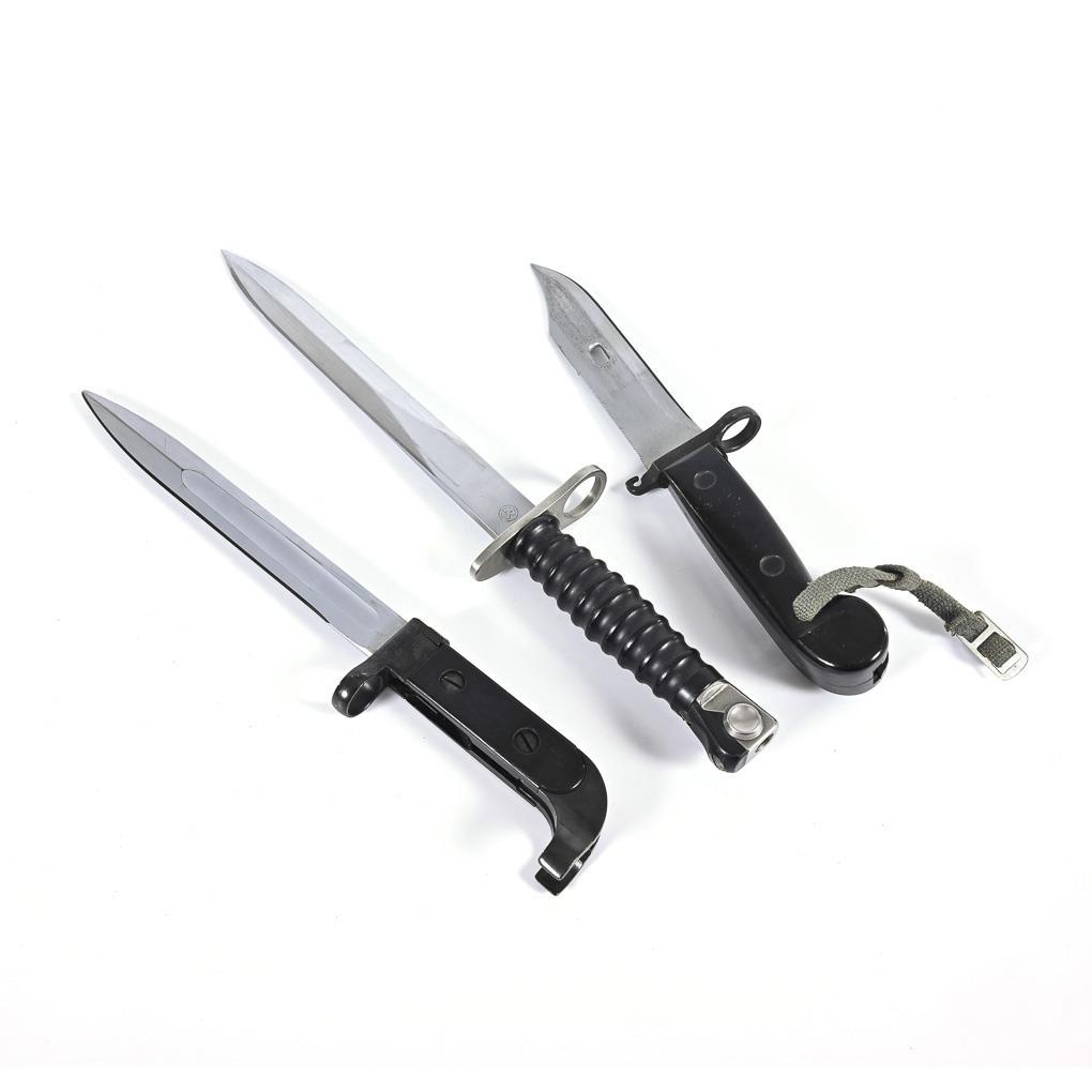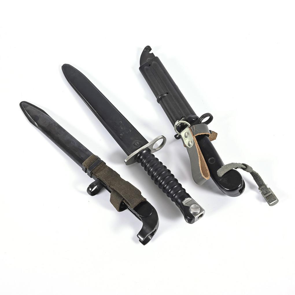 Schweizer Bajonett, "Modell 1957", gerade, zweischneidige Klinge, gemarkt "F+W" im Kreis, genummert. Kunststoffgriff breit gerippt, Plastikscheide. Gesamt L 38 cm. / Bajonett zur AK 47, wohl DDR, ungemarkt. Klinge teilweise mit Sägerücken, versetzter Spitze und Loch. Griff und Scheide aus Plastik, mit Lederschlaufe. Gesamt L 33 cm. / Anderes Bajonett für AK 47, wohl aus DDR Produktion. Ringteil graviert "S 4318", sonst keine Kennzeichnung. Griff und Scheide aus Eisen, Gewebschlaufe. Gesamt L 32,5 cm.