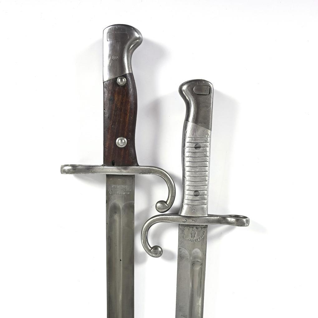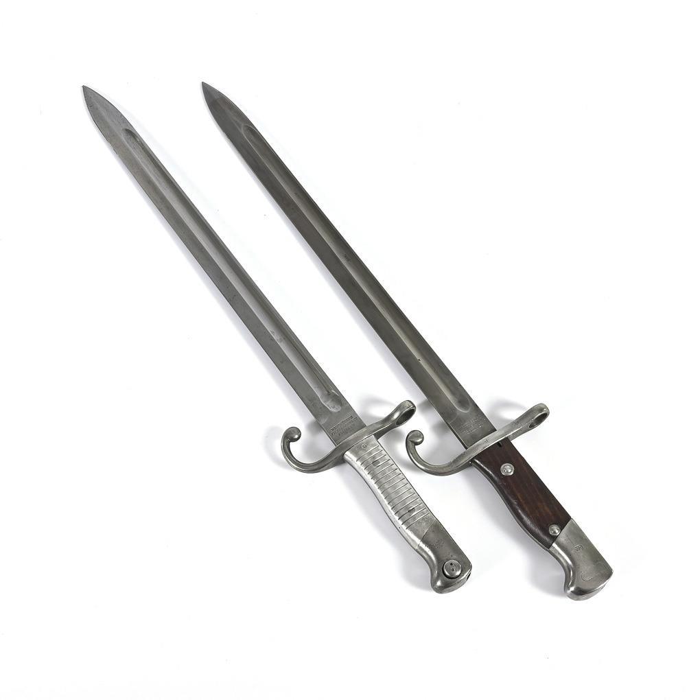 Modell M 1891 mit Aluminium-Griffschalen. Gerade, einschneidige Klinge gemarkt: "Modelo Argentino 1891" , gefertigt bei "Weyersberg, Kirschbaum & Co, Solingen". Waffe und Scheide nummerngleich. Scheide mit Gebrauchsspuren. Gesamt L 54 cm. / Modell M 1909 mit Holzgriff. Gleiche Klinge, gemarkt: "Modelo Argentino 1909", gleicher Hersteller, Scheide und Waffe nummerngleich. Lederschuh. Gesamt L 55 cm.