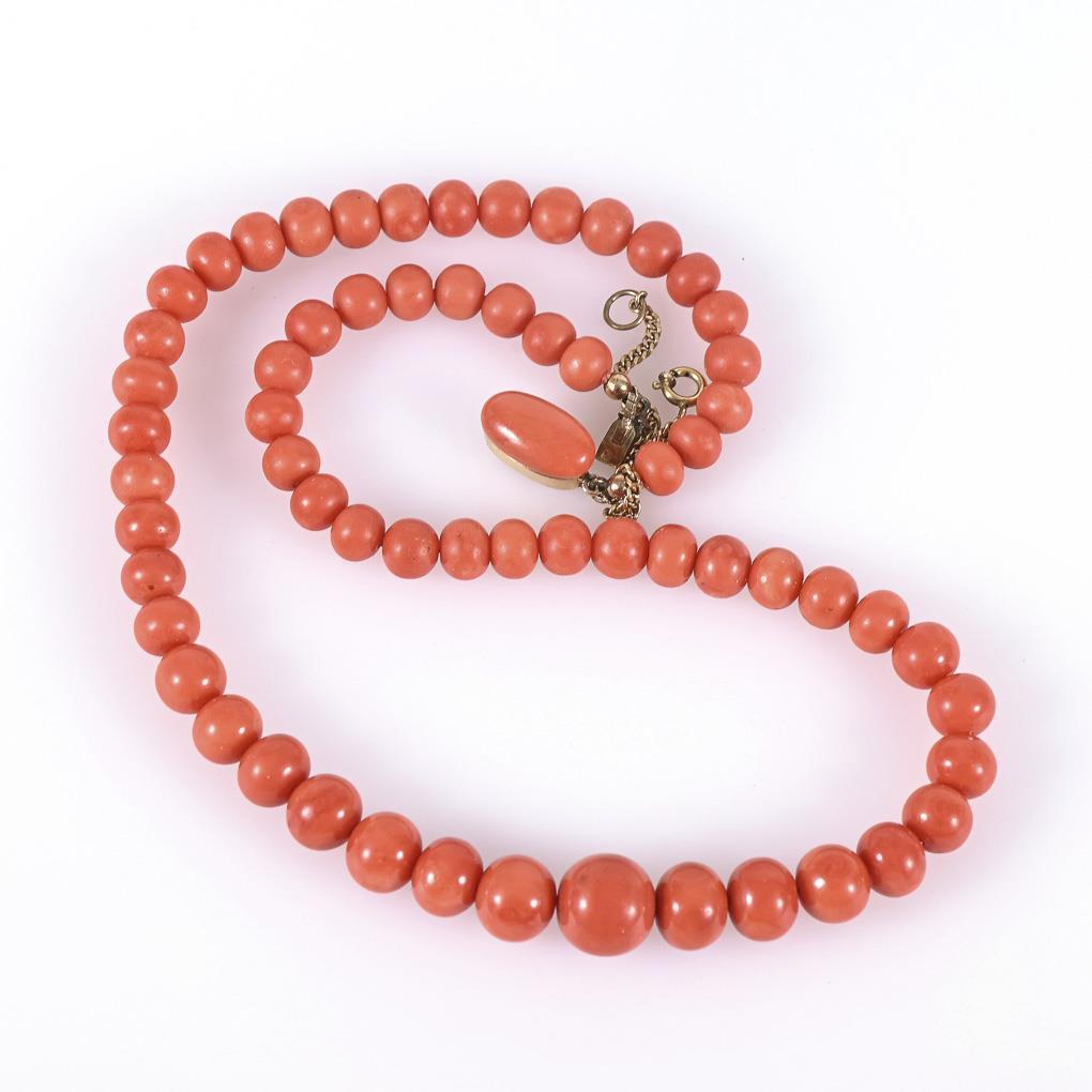 Gelbgoldschließe 585 geprüft. L 48 cm. Korallen Ø 0,7-1,8 cm. 50,8 g.