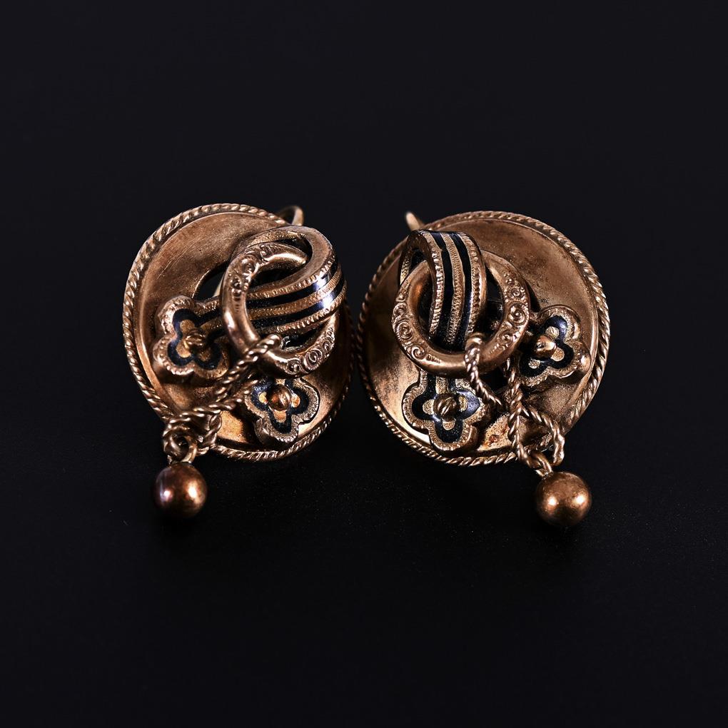 Ringbrisuren mit partiell schwarzemaillierten Montierungen und kleinen Kugelabhängungen. Scharnierbügel.